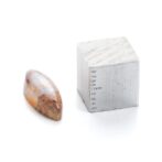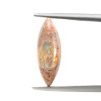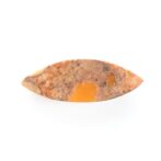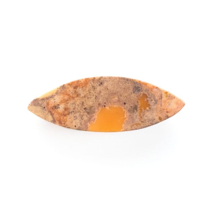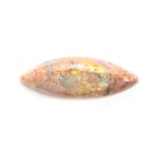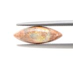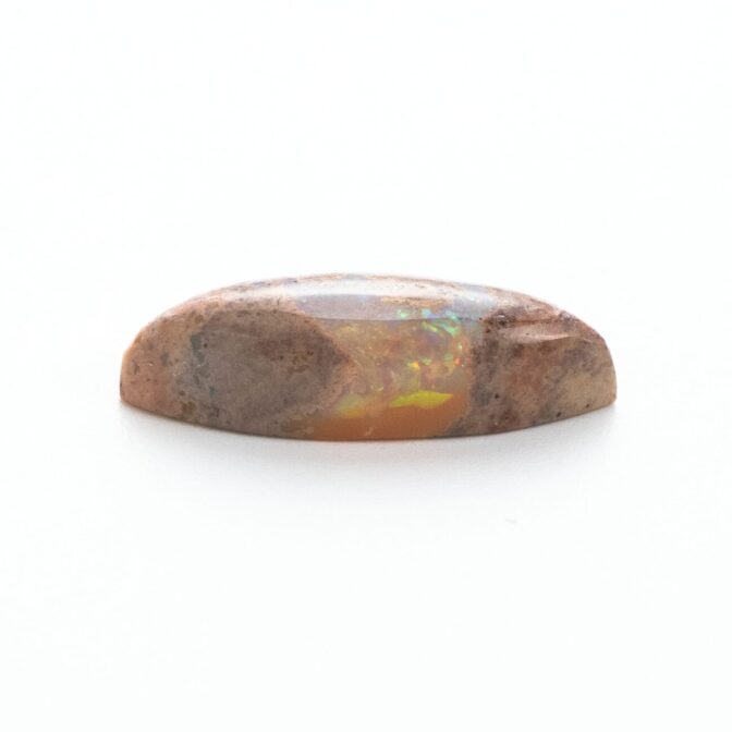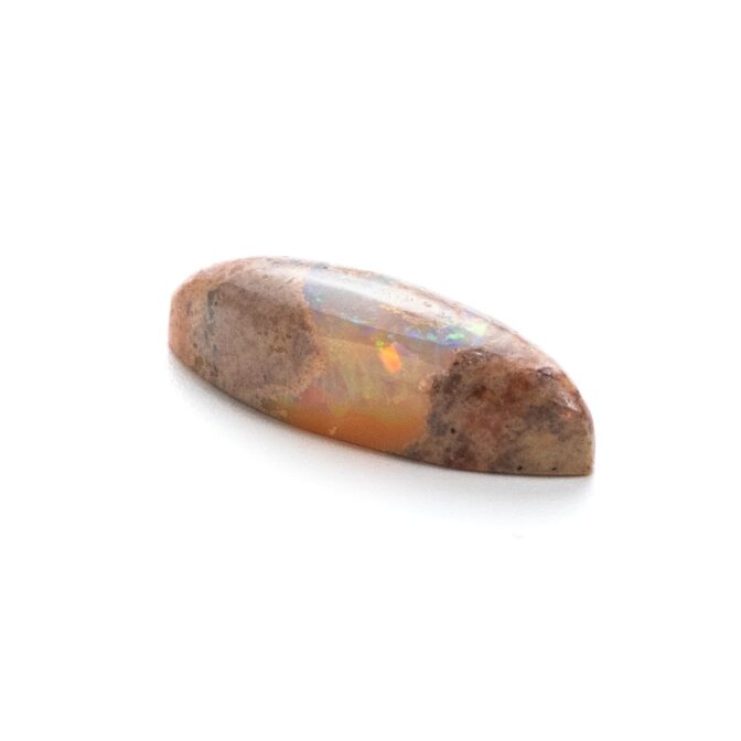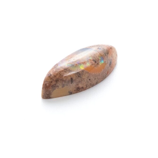オパール層と母岩のコントラストが見どころのカンテラオパールは、大粒になりがち。ところが、今回私がセレクトしたルースはごくごく小粒です。その代わり、まるでオーストラリアのオパールのような白く輝くオパールが燦然ときらめき、シャープなマーキスカボションの形にカットされています。ちらちらと七色に瞬く遊色がぎっしりと入り込み、透け感あるオパール層を上からのぞくと、深く折り重なった輝きに圧倒されてしまいます。品の良い母岩のオレンジベージュの穏やかな色合いにも魅せられてしまいます。
