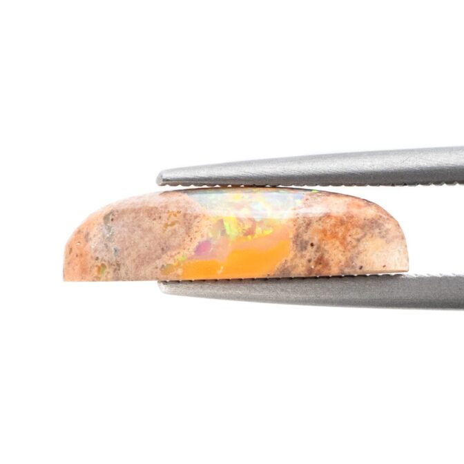 乾いた大地を思わせるオレンジベージュの母岩から、文字通りカンテラの灯りを思わせる虹色のオパールが輝く姿が異彩を放ちます。