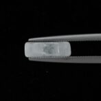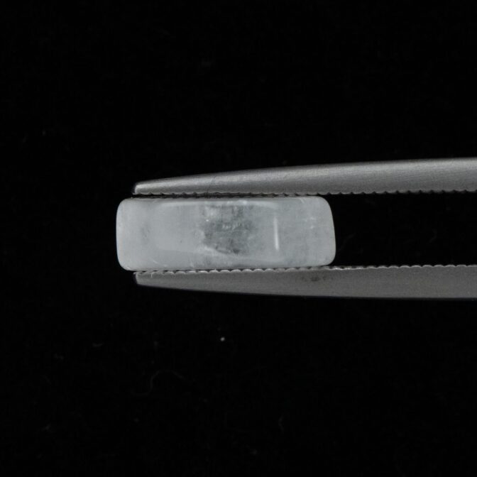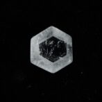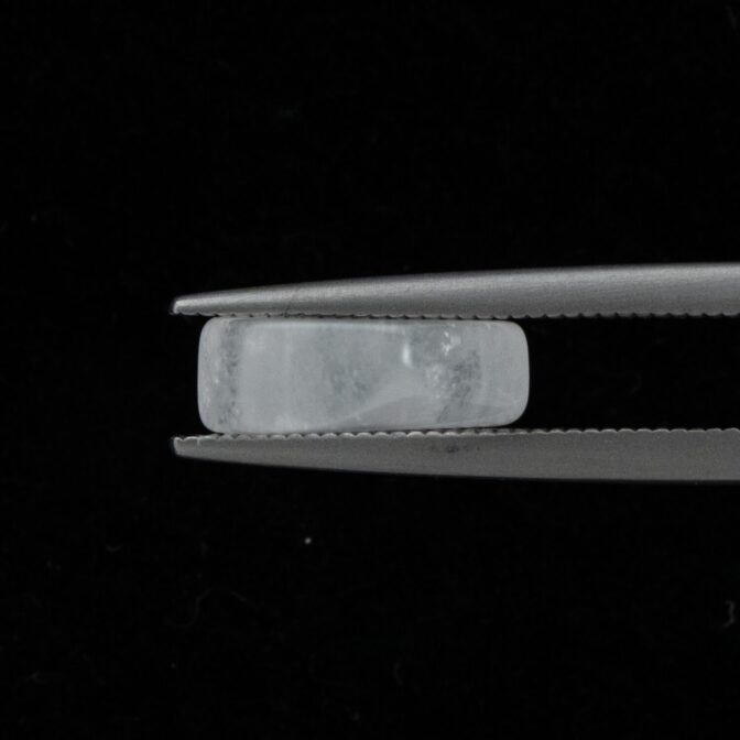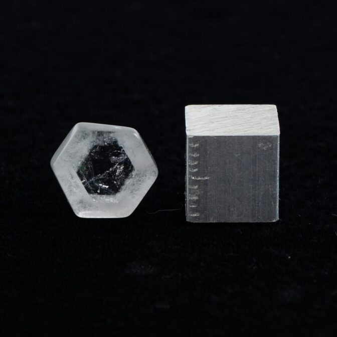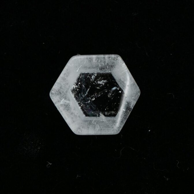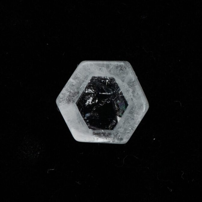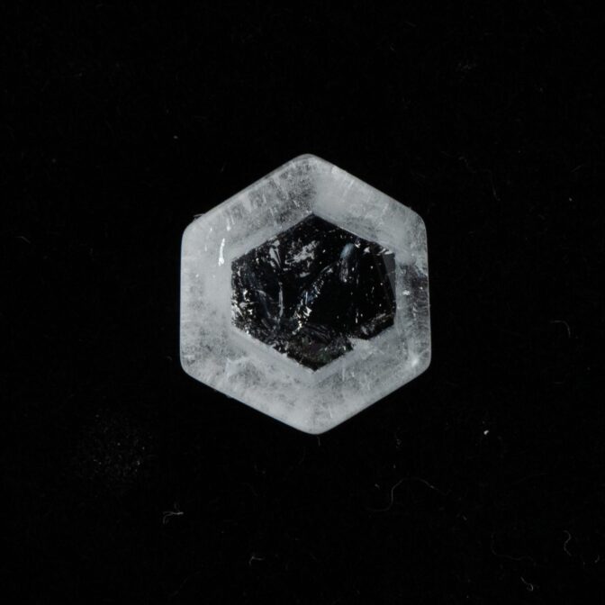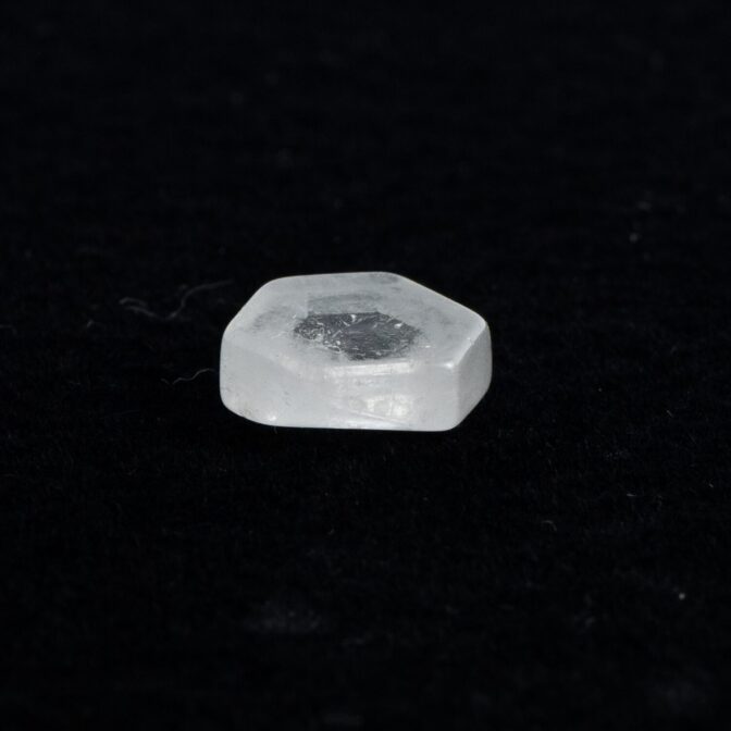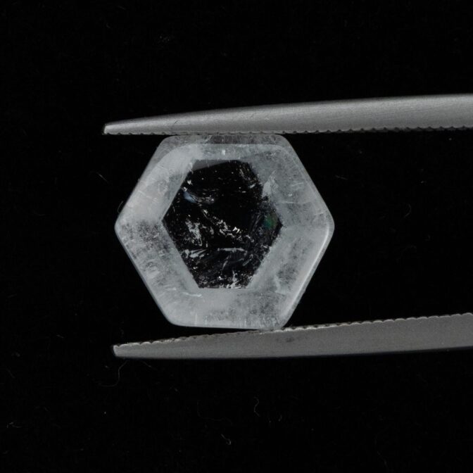 そんなこんなで出来上がってきたのは、不思議な形のファントムクォーツを、シンプルにファントムに沿って適度な厚みにスライスし、丸みのある六角形の可愛らしいルースに仕上げたこちら。白くキラキラと光を受けて輝く外周はふんわりとした薄曇りクォーツ。その真ん中に、透明度の高いクォーツが窓のように見え、冬の曇りガラスのようですね。ルースとして石取りをする時に、デザインに迷うことが多いファントム系の原石を、肩の力が抜けた感じに程よくカジュアルにカットしてあります。サイズ感も程よく、観賞用にもジュエリーにもなりそうな佇まいです。