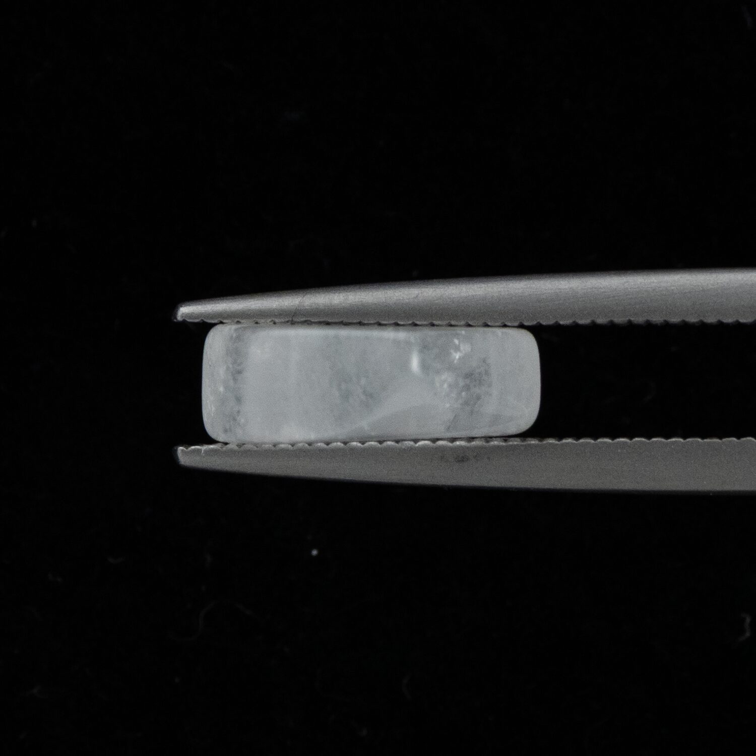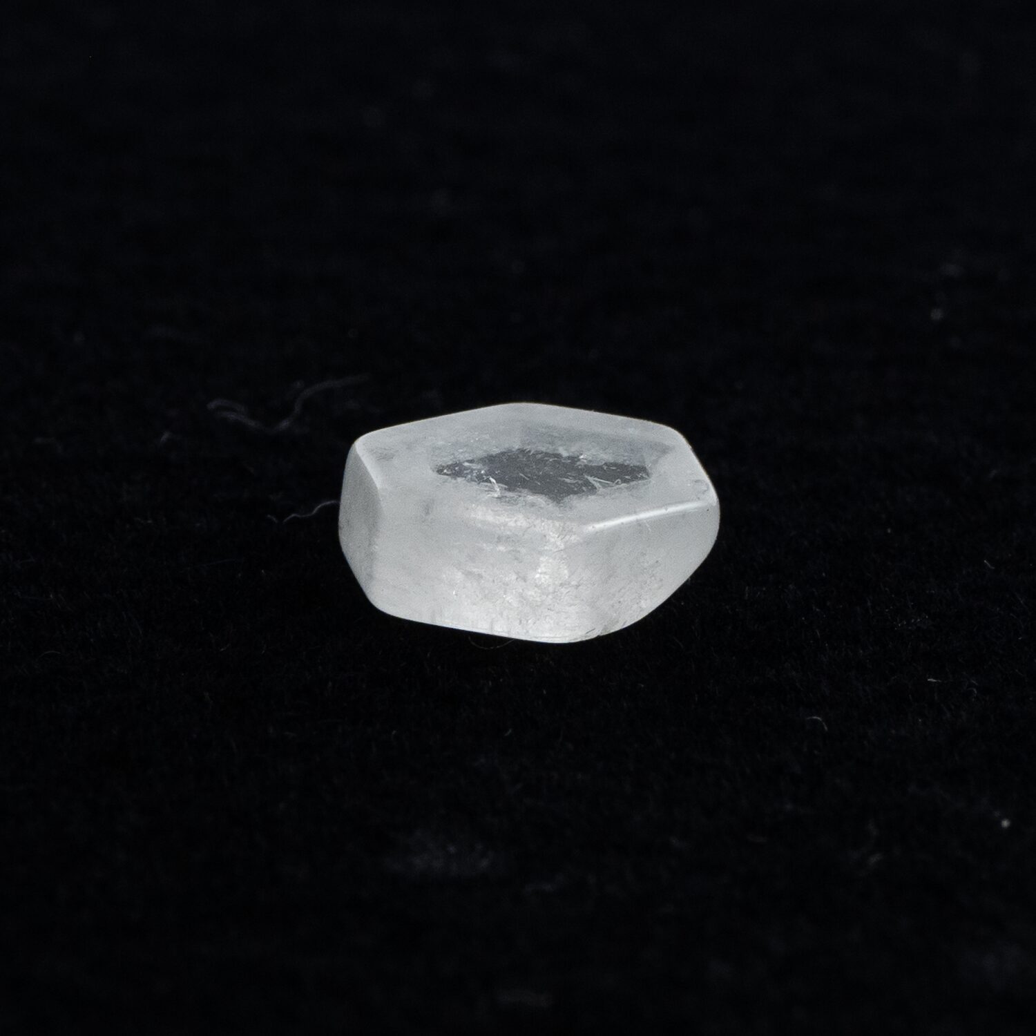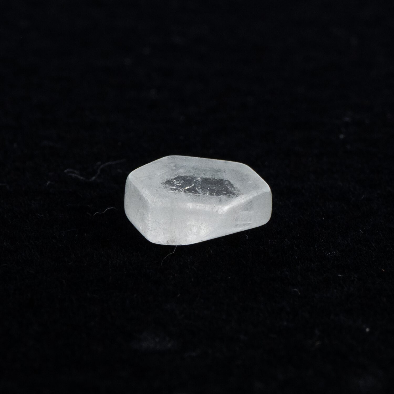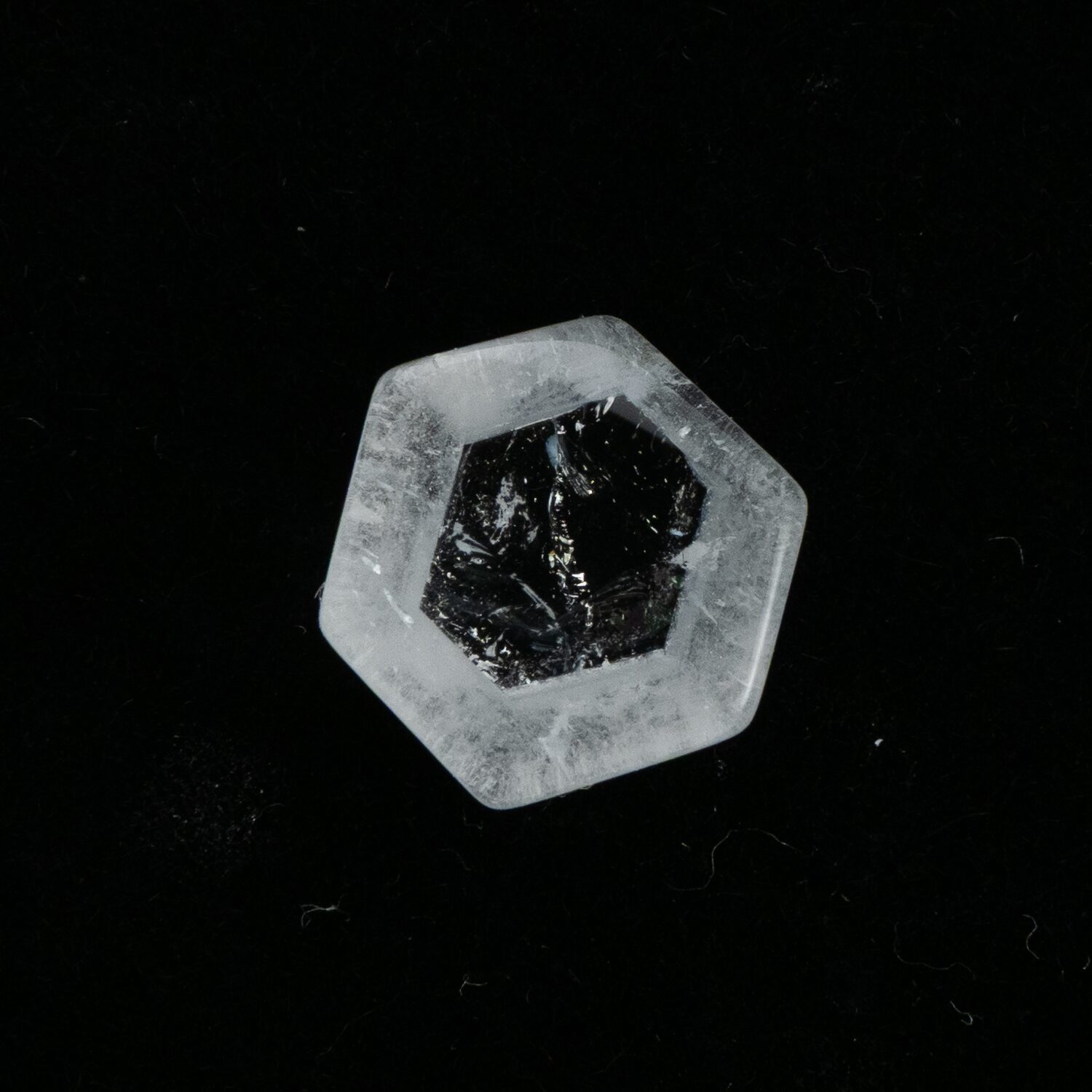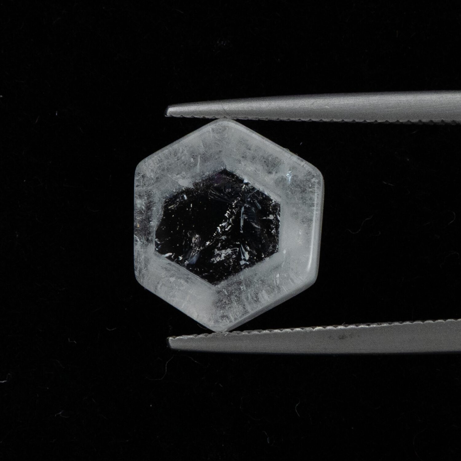 そんなこんなで出来上がってきたのは、不思議な形のファントムクォーツを、シンプルにファントムに沿って適度な厚みにスライスし、丸みのある六角形の可愛らしいルースに仕上げたこちら。白くキラキラと光を受けて輝く外周はふんわりとした薄曇りクォーツ。その真ん中に、透明度の高いクォーツが窓のように見え、冬の曇りガラスのようですね。ルースとして石取りをする時に、デザインに迷うことが多いファントム系の原石を、肩の力が抜けた感じに程よくカジュアルにカットしてあります。サイズ感も程よく、観賞用にもジュエリーにもなりそうな佇まいです。