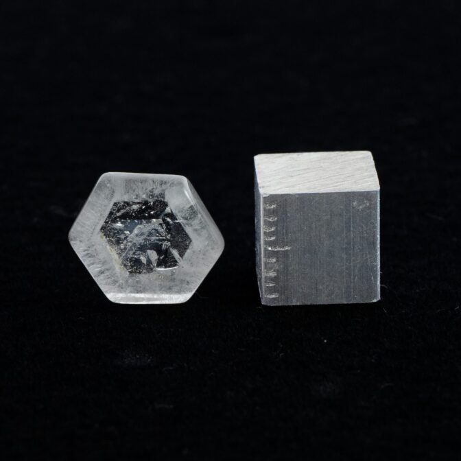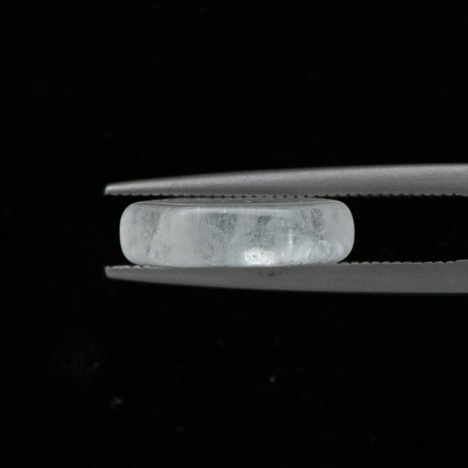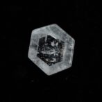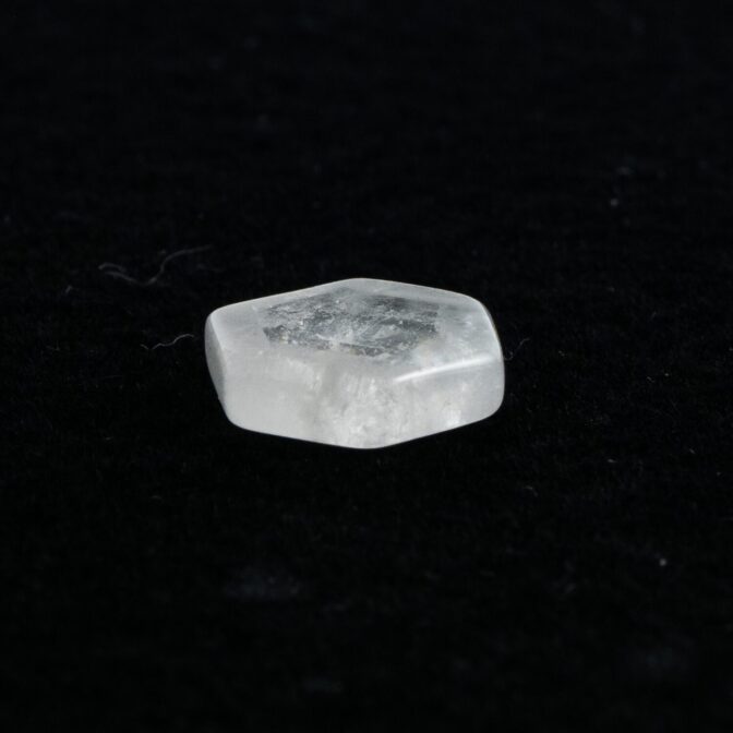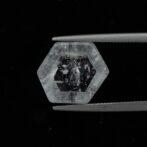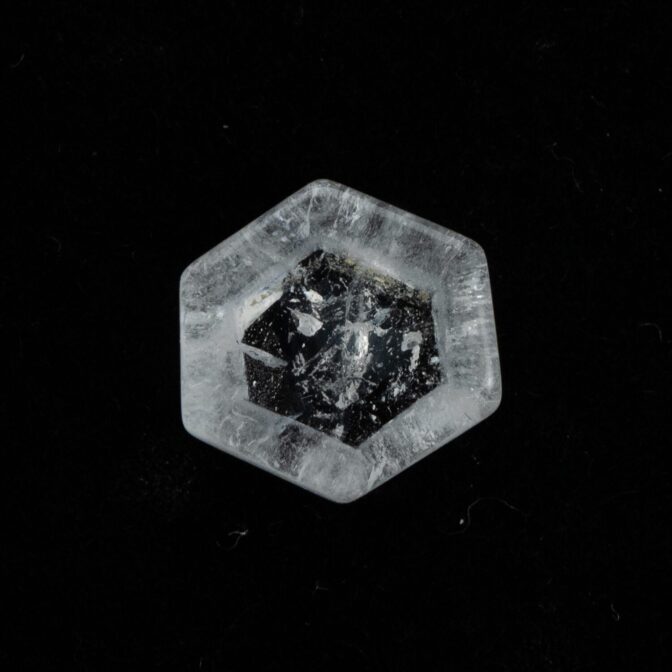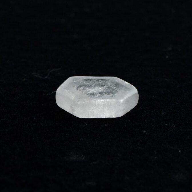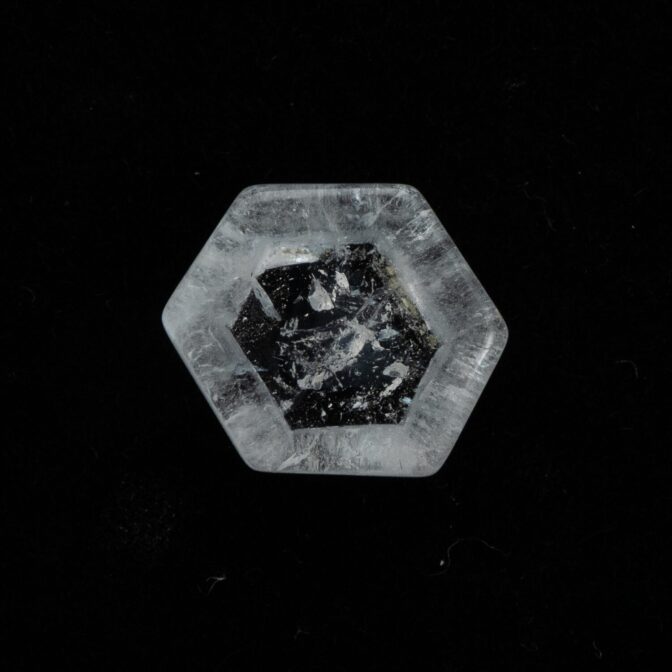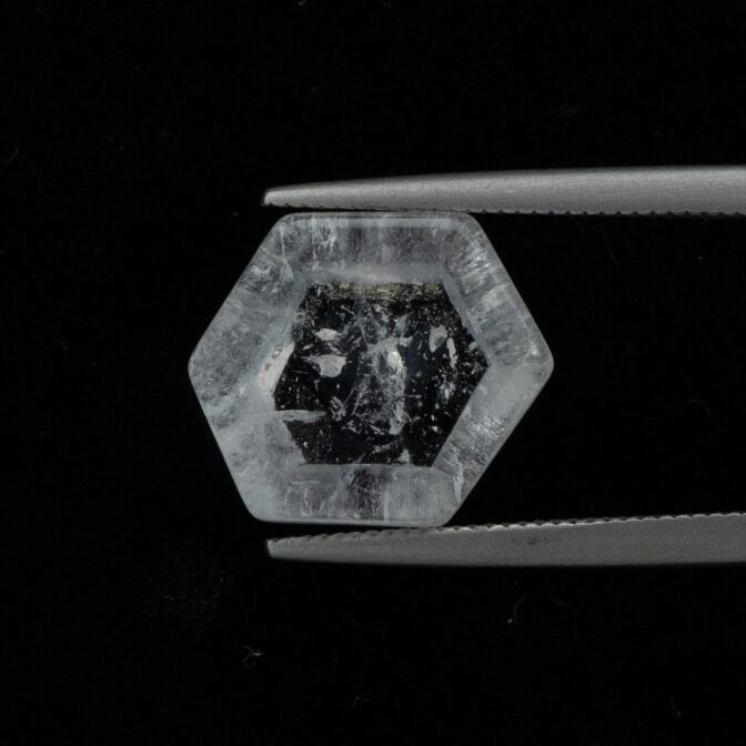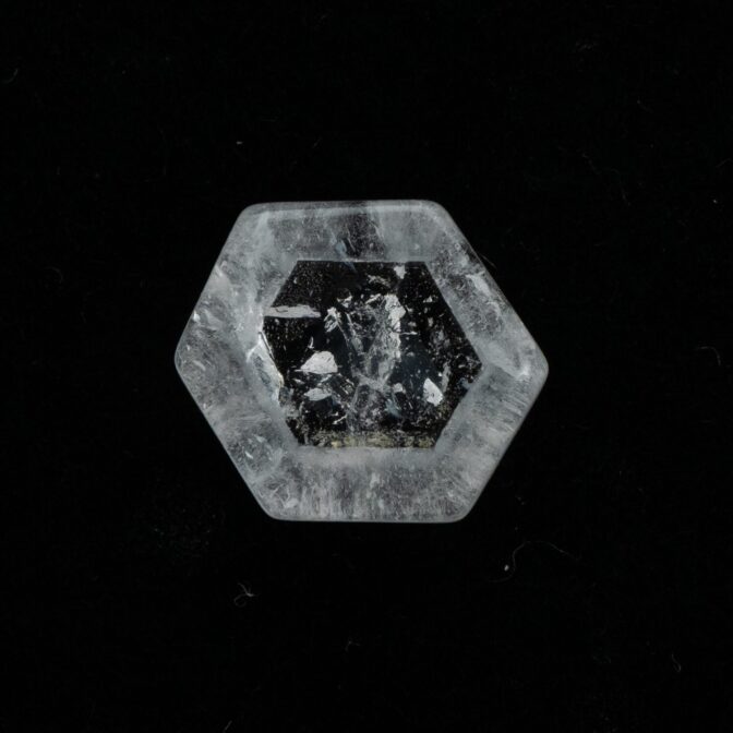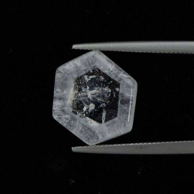 そんなこんなで出来上がってきたのは、不思議な形のファントムクォーツを、シンプルにファントムに沿って適度な厚みにスライスし、丸みのある六角形の可愛らしいルースに仕上げたこちら。白くキラキラと光を受けて輝く外周はふんわりとした薄曇りクォーツ。その真ん中に、透明度の高いクォーツが窓のように見え、冬の曇りガラスのようですね。ルースとして石取りをする時に、デザインに迷うことが多いファントム系の原石を、肩の力が抜けた感じに程よくカジュアルにカットしてあります。サイズ感も程よく、観賞用にもジュエリーにもなりそうな佇まいです。
