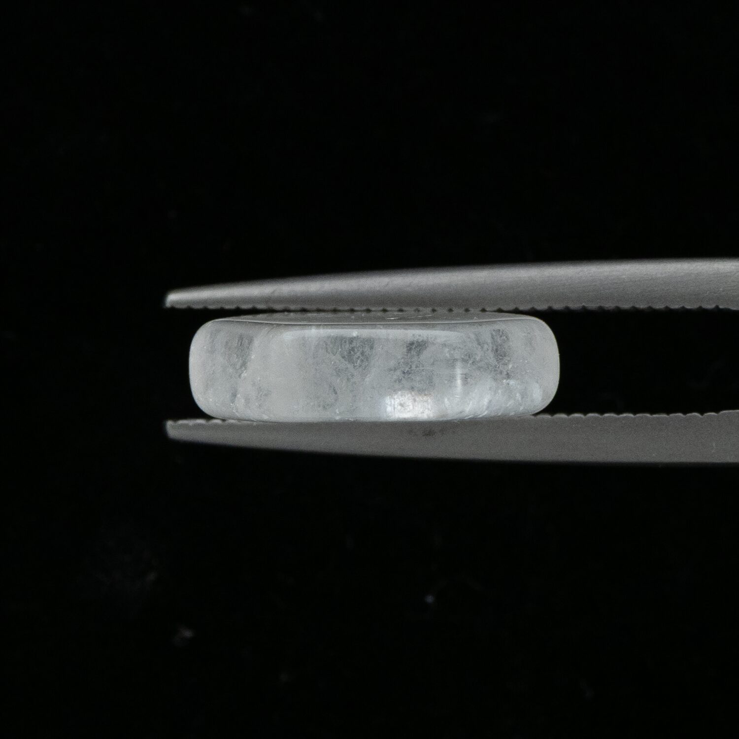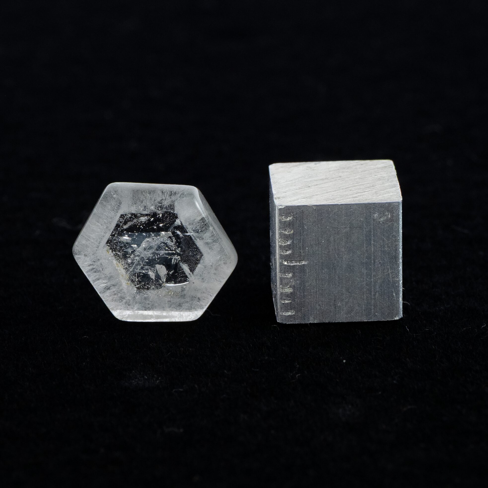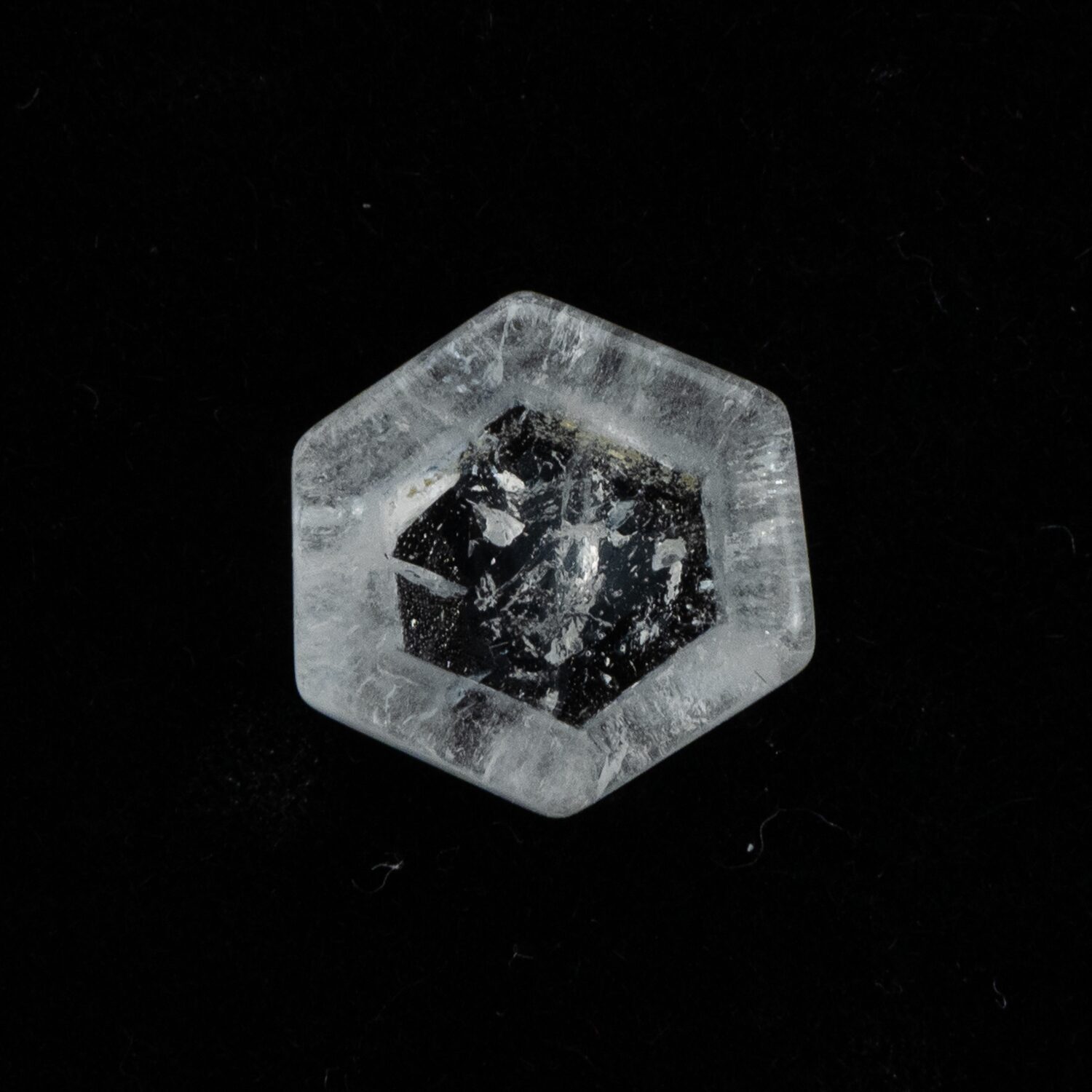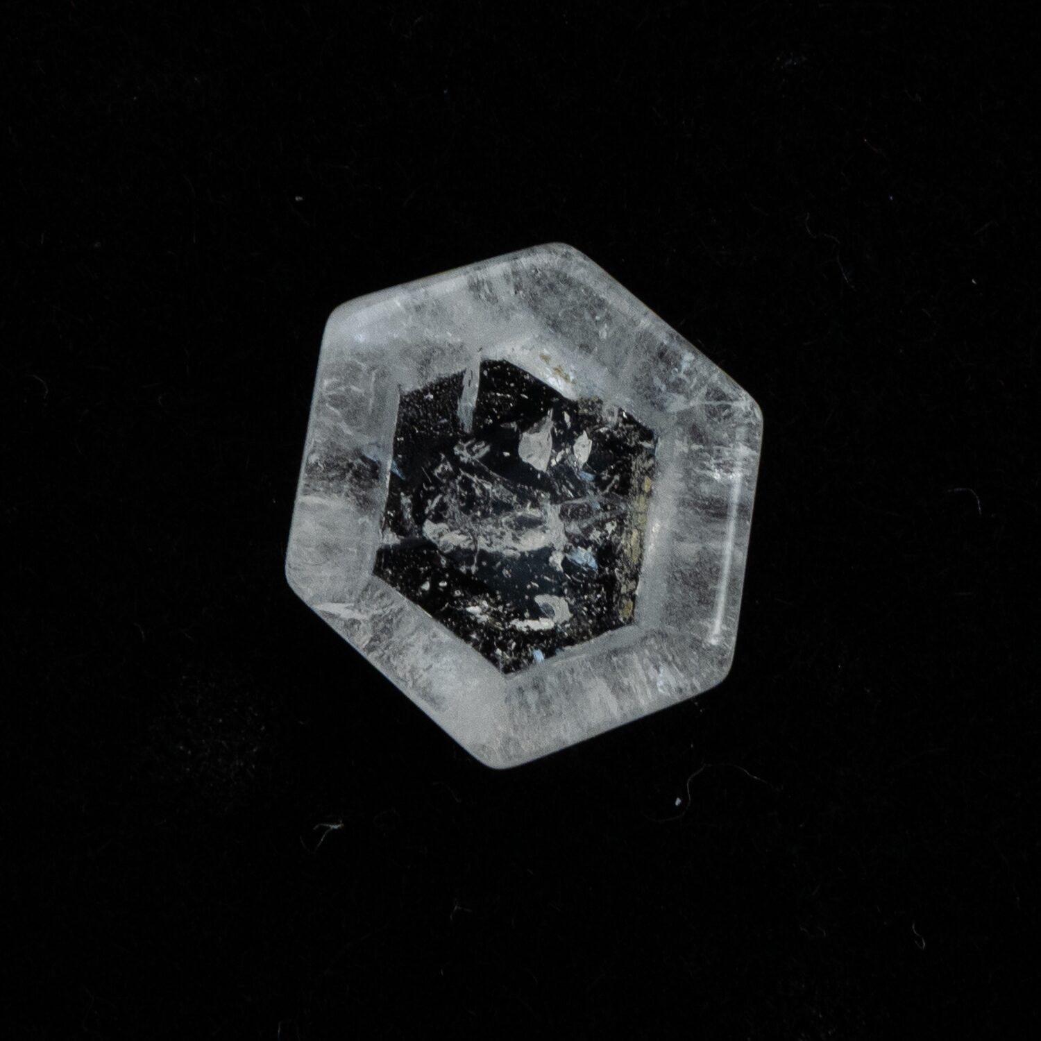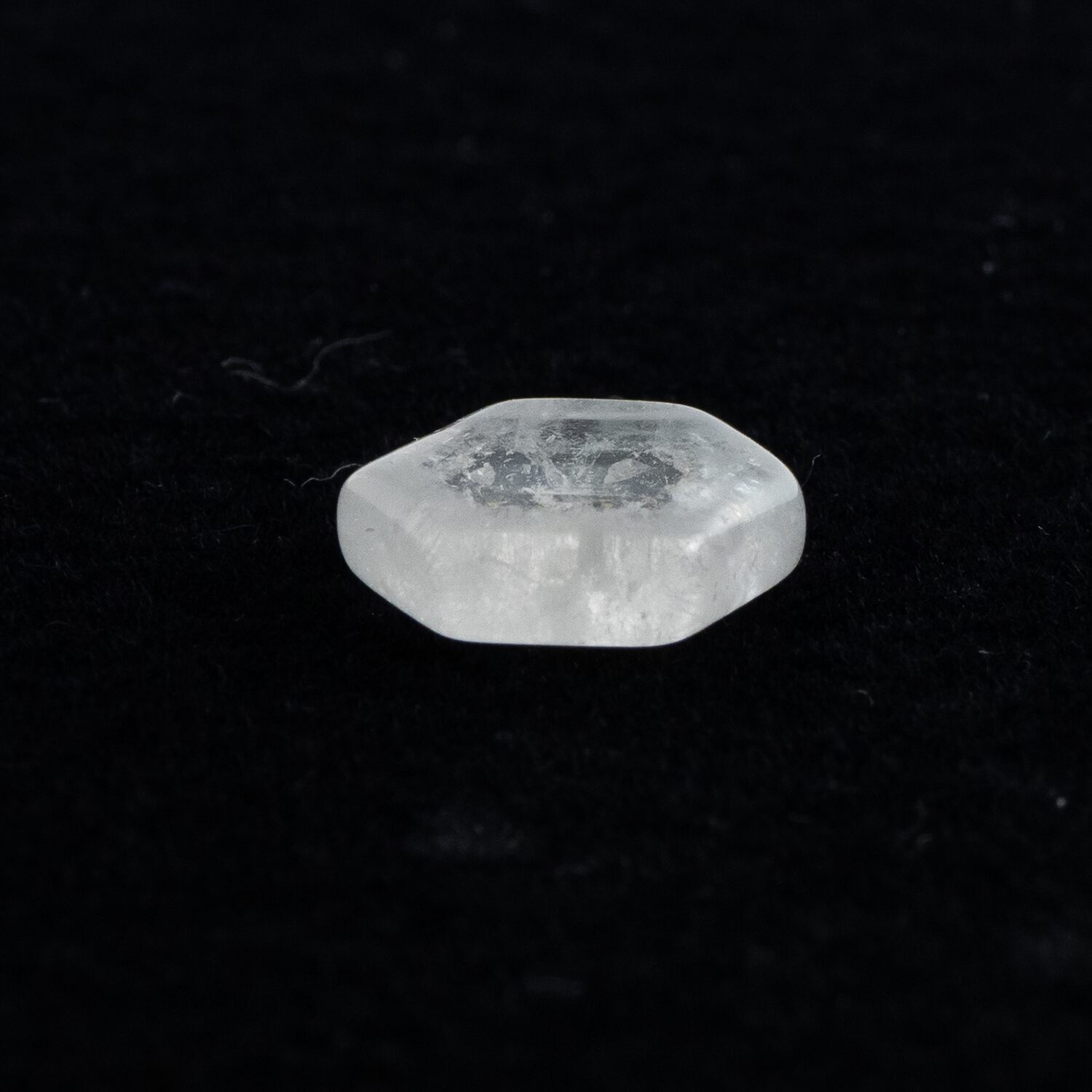 そんなこんなで出来上がってきたのは、不思議な形のファントムクォーツを、シンプルにファントムに沿って適度な厚みにスライスし、丸みのある六角形の可愛らしいルースに仕上げたこちら。白くキラキラと光を受けて輝く外周はふんわりとした薄曇りクォーツ。その真ん中に、透明度の高いクォーツが窓のように見え、冬の曇りガラスのようですね。ルースとして石取りをする時に、デザインに迷うことが多いファントム系の原石を、肩の力が抜けた感じに程よくカジュアルにカットしてあります。サイズ感も程よく、観賞用にもジュエリーにもなりそうな佇まいです。