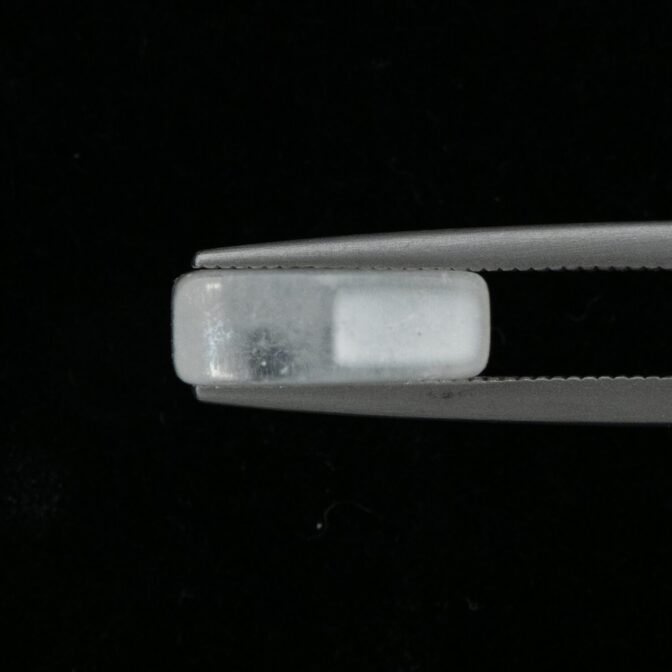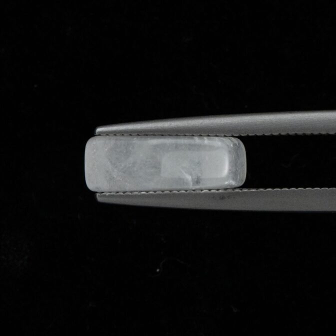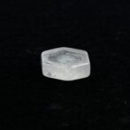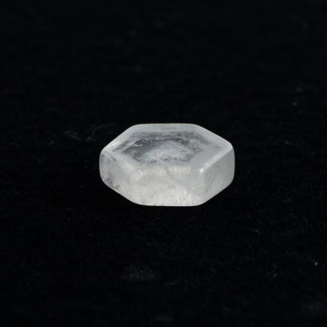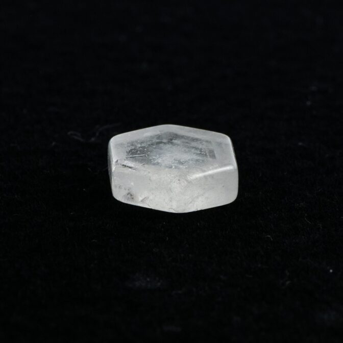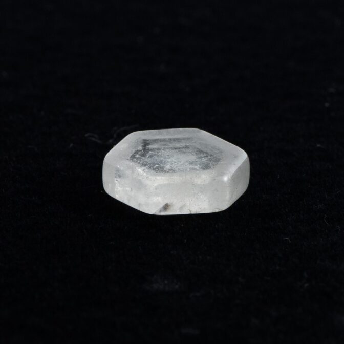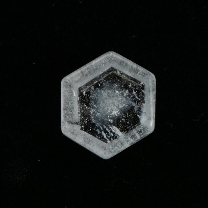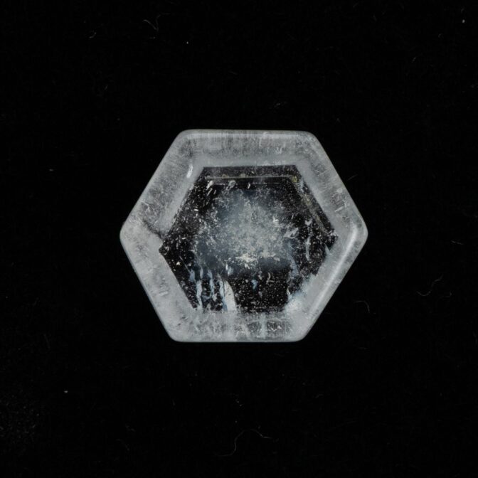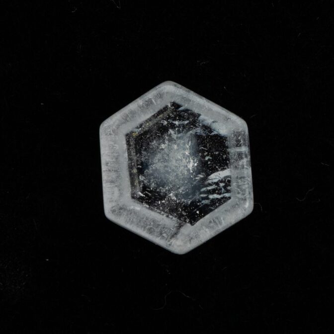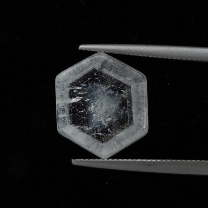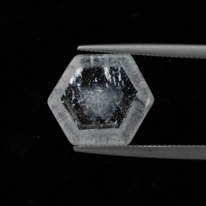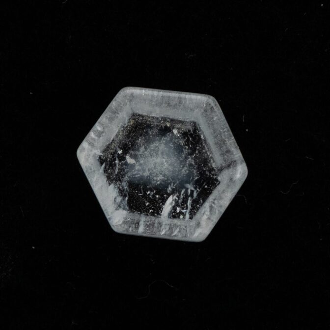 そんなこんなで出来上がってきたのは、不思議な形のファントムクォーツを、シンプルにファントムに沿って適度な厚みにスライスし、丸みのある六角形の可愛らしいルースに仕上げたこちら。白くキラキラと光を受けて輝く外周はふんわりとした薄曇りクォーツ。その真ん中に、透明度の高いクォーツが窓のように見え、冬の曇りガラスのようですね。ルースとして石取りをする時に、デザインに迷うことが多いファントム系の原石を、肩の力が抜けた感じに程よくカジュアルにカットしてあります。サイズ感も程よく、観賞用にもジュエリーにもなりそうな佇まいです。