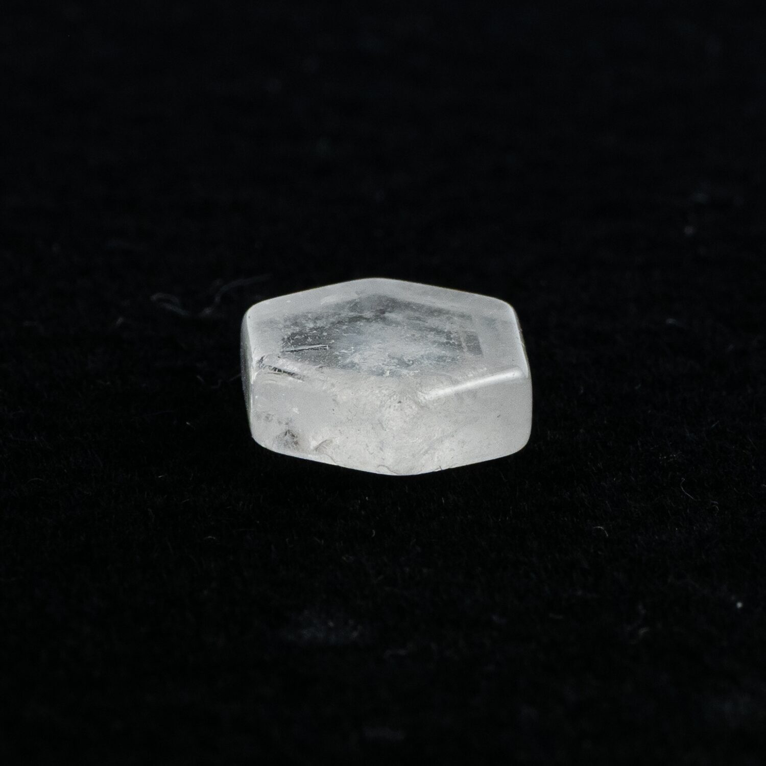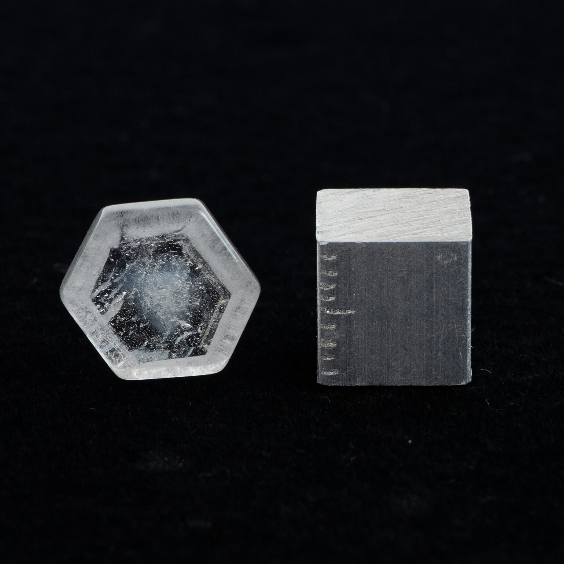 そんなこんなで出来上がってきたのは、不思議な形のファントムクォーツを、シンプルにファントムに沿って適度な厚みにスライスし、丸みのある六角形の可愛らしいルースに仕上げたこちら。白くキラキラと光を受けて輝く外周はふんわりとした薄曇りクォーツ。その真ん中に、透明度の高いクォーツが窓のように見え、冬の曇りガラスのようですね。ルースとして石取りをする時に、デザインに迷うことが多いファントム系の原石を、肩の力が抜けた感じに程よくカジュアルにカットしてあります。サイズ感も程よく、観賞用にもジュエリーにもなりそうな佇まいです。