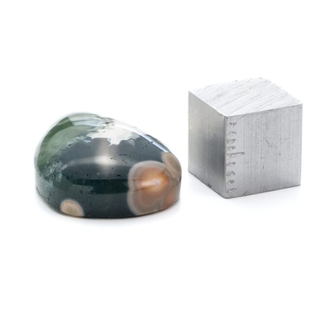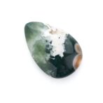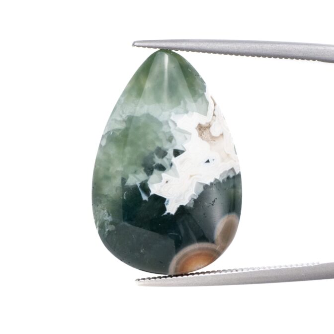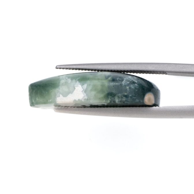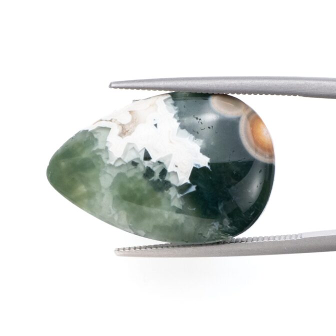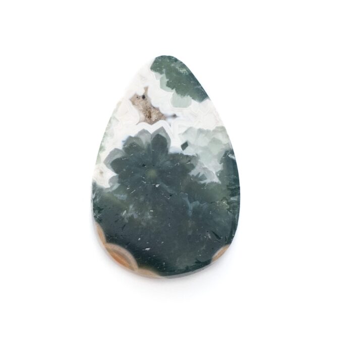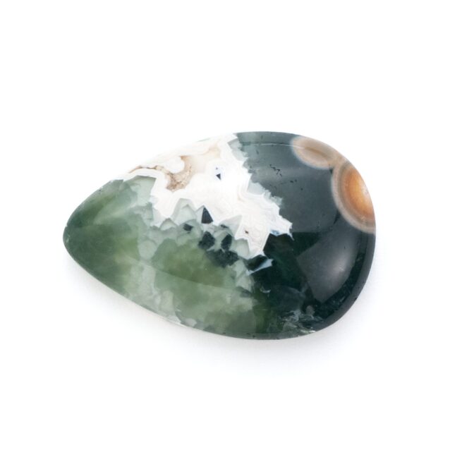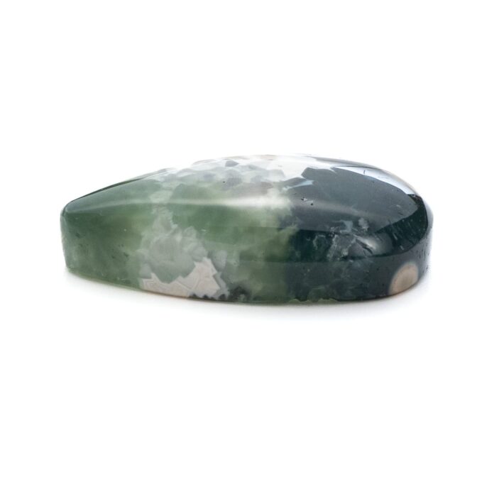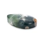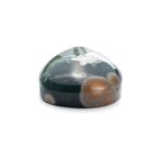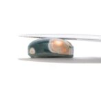 このページでご紹介しているオーシャンジャスパーは、なんとも不思議な印象で、とても目を引きます。マットでピュアなホワイトカラーと、それとは対象的な透明感あふれる深いグリーンカラーが見事な調和を描きます。複雑に折り重なる色のグラデーションが美しく、奥深い魅力です。下の方には綺麗な同心円を描く水玉模様が。よく見るとふんわりとピンク色を帯びており、可愛いアクセントになっています。不思議な透明感と、マット味があるホワイトと透明・不透明グリーンとの質感の差が何とも言えない味わいになっています。典型的なオーシャンジャスパーのような、そうでないような、ミステリアスな美しさが味わえます。