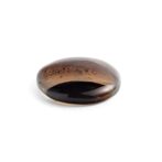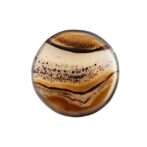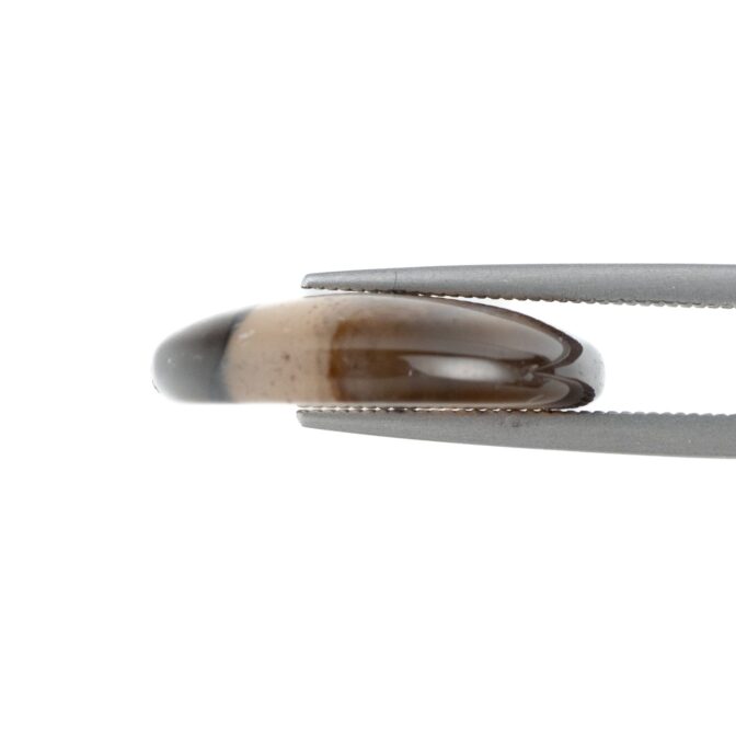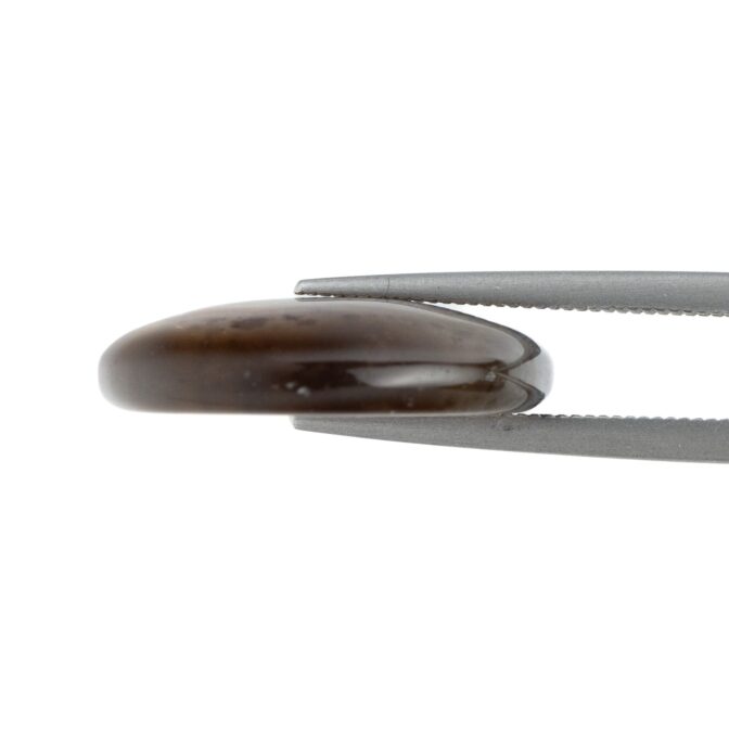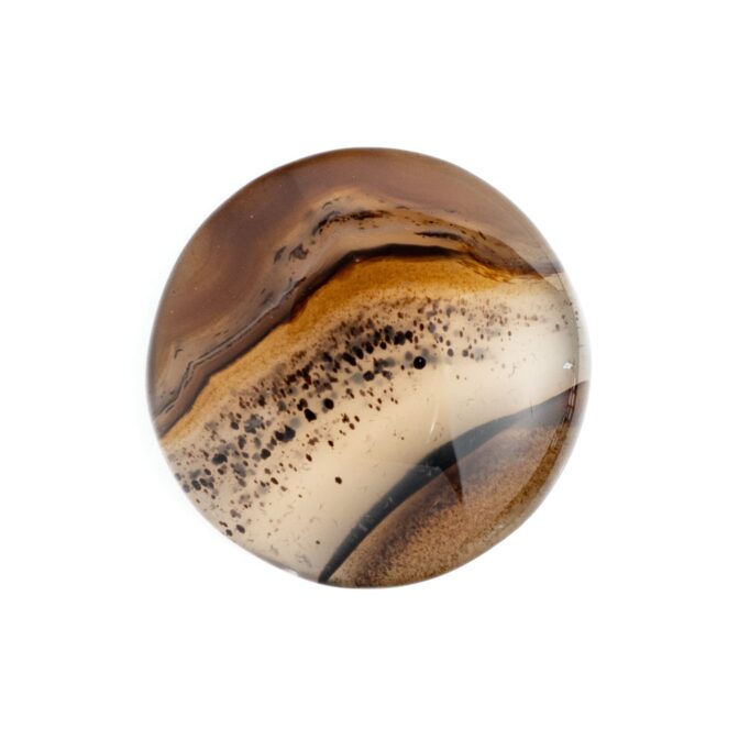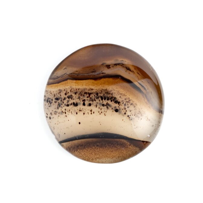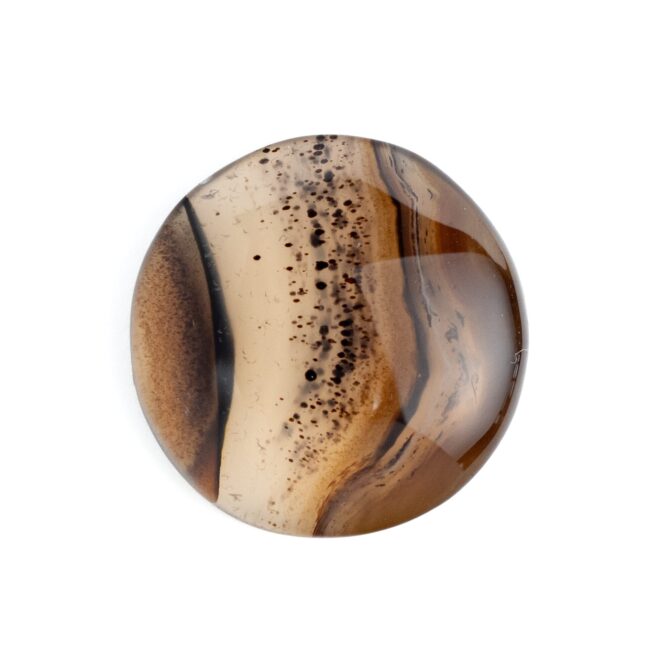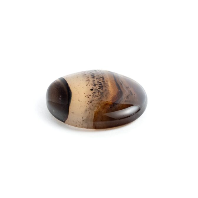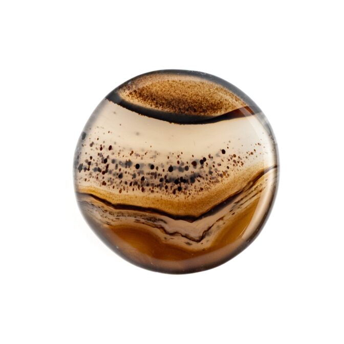 全体的に透明度が高く、透け感が美しい石の中に、水玉模様がふわふわと浮遊するように入り込み、流れるように流麗なブラウンのラインが美しいグラデーションを描きます。丸みのある形に研磨されていますが、可愛いというよりはグッと洗練された印象。幻想的だけれども、どこか温かみがあり、それでいて乾いた砂漠のような質感を感じるところが不思議です。静かな輝きを湛えるつややかでまろやかなルースは、ジュエリーやアクセサリにして身につければ、上品かつシックな装いになりそうです。