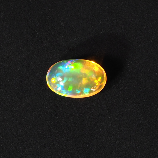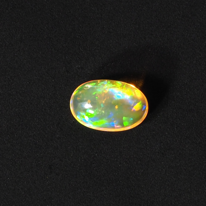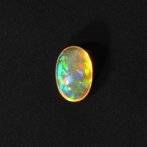 穏やかな光のもとでは珍しいスカイブルーの遊色が目立ち、強い光ではグリーンと深いブルーの遊色が湧き出します。ほかにも赤、黄色と様々な光のピグメントを持つ稀有なファイアオパールです。
