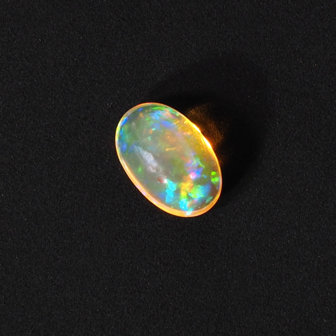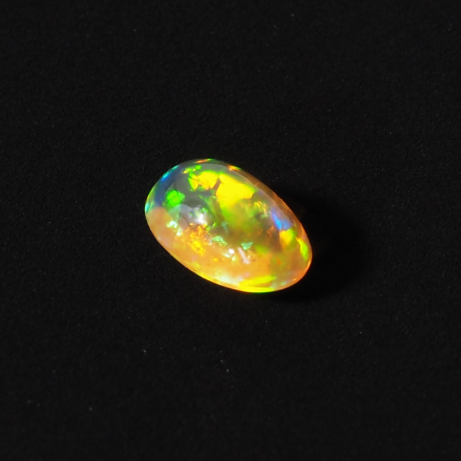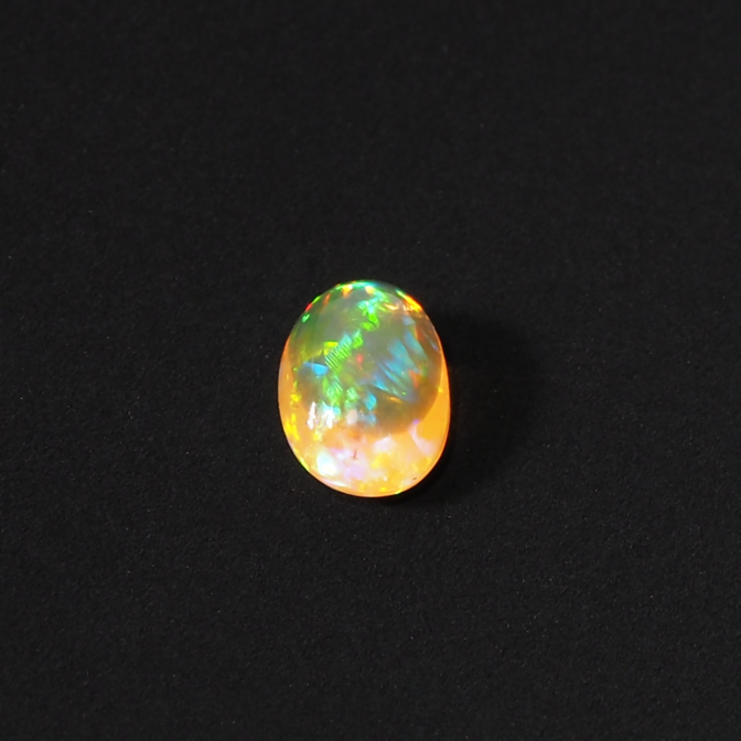 小ぶりながらも存在感があるのは、角度を変えるたびに強くゆらゆらと光を弾く遊色がとても強いから。透明なイエローオレンジのベースカラーもこの遊色を引き立てています。手間をかけ、きちんと下処理がされた上で仕上げ磨きをしてこそ、このようなうるうるの艶を放つ美しいルースになります。左右対称でなだらかなカーブを描くシェイプも見事です。