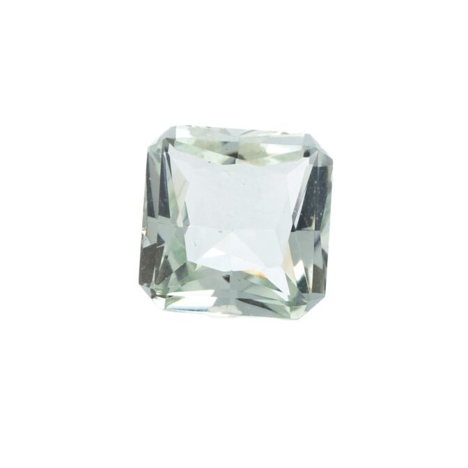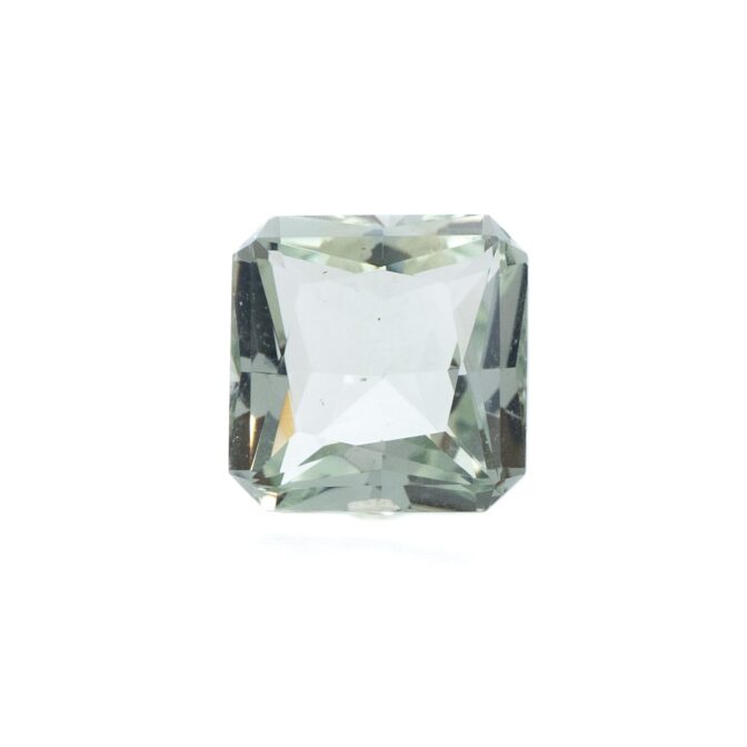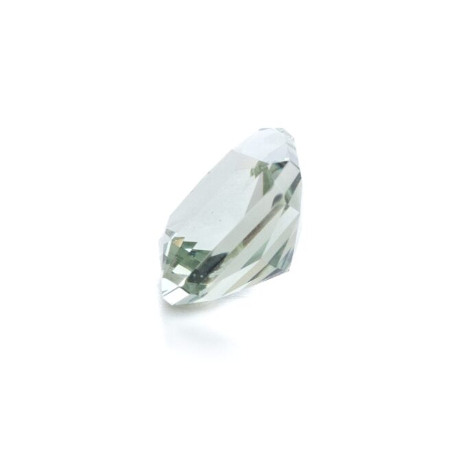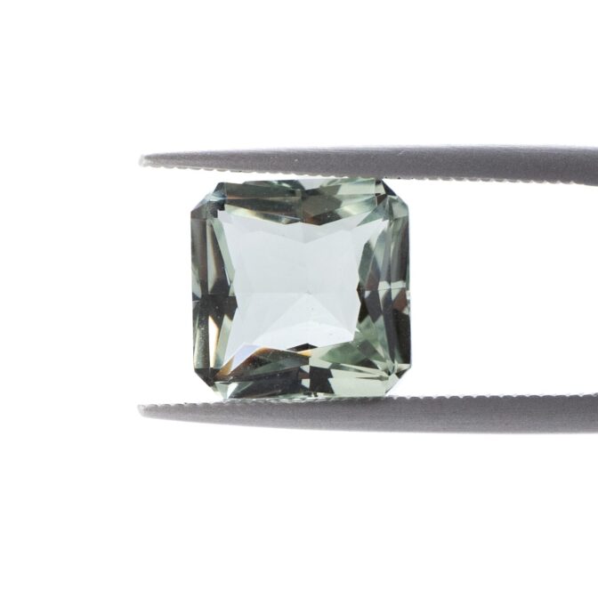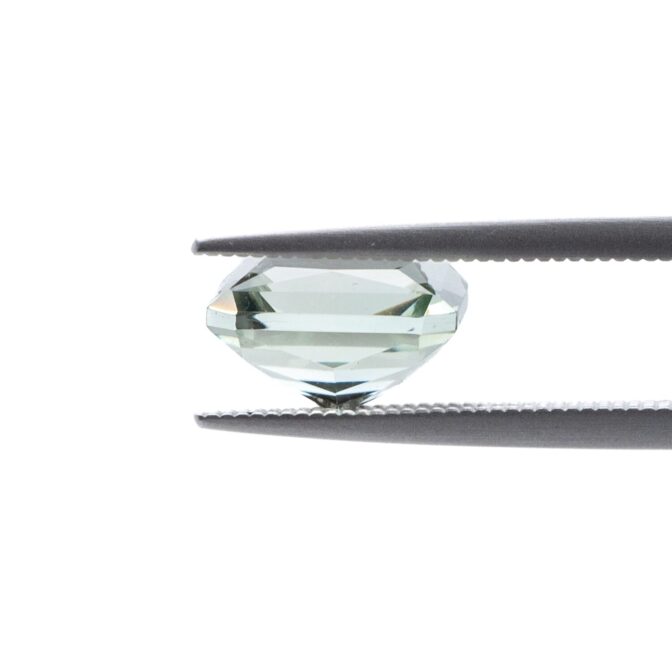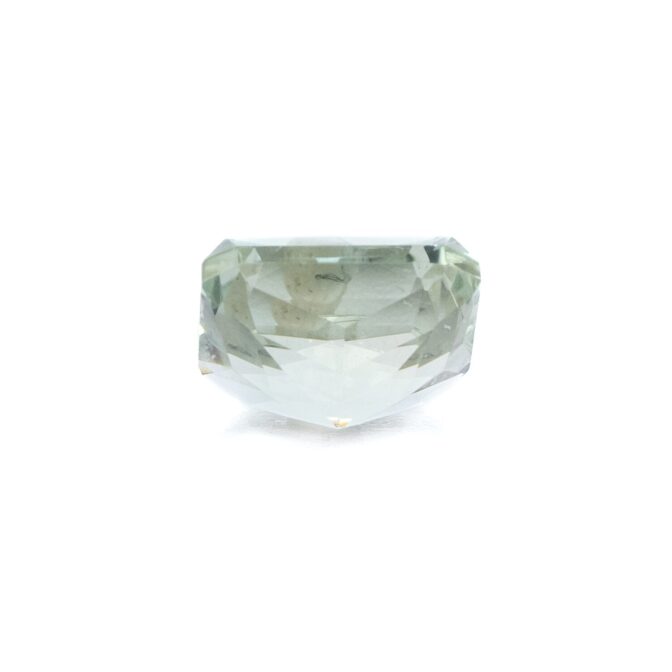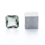 プレシオライトとも呼ばれるこちらのルースは、あくまでも透明なミントグリーン。自然界には見られず、紫のアメジストを加熱することによって得られる色です。ほとんどの紫アメジストは加熱をするとブラウンからイエローになり、シトリンとして市場に流通します。美しいカラーのグリーンに変化するアメジストは非常に稀で、あまり市場には出回りません。