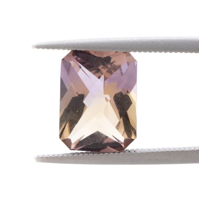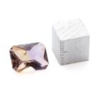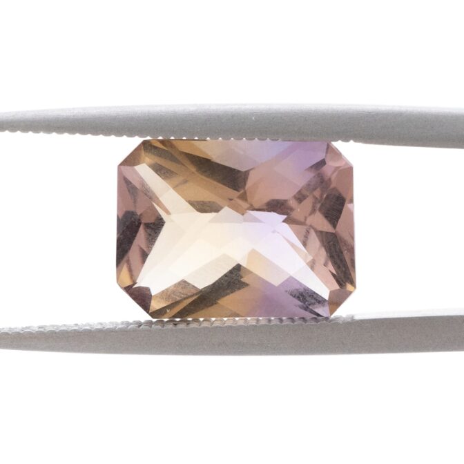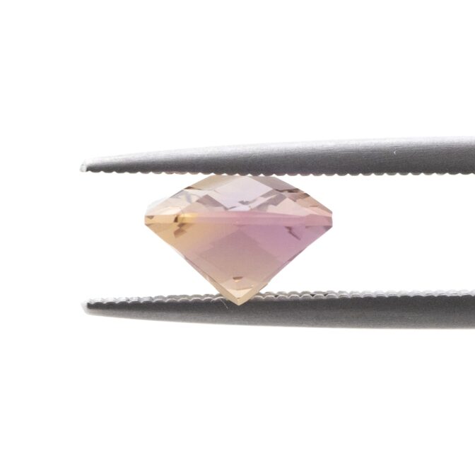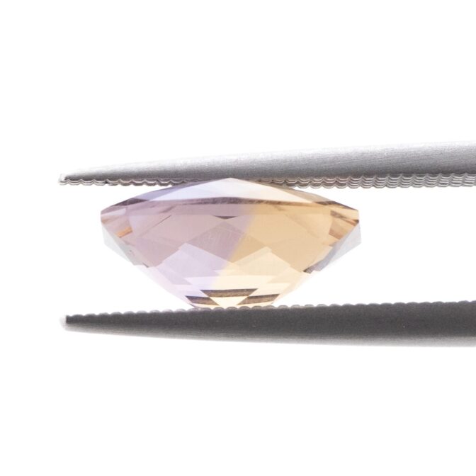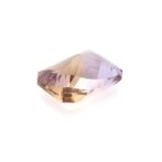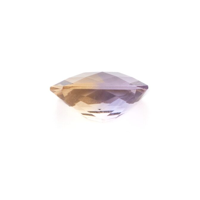 今回入荷したアメトリンも上品な美しさはそのままに、手の込んだカットによって魅力が倍増しています。表はシンプルなチェスカット。裏はシザーズカットと呼ばれ、対角線上にXの形に面が入っています。この2つのカットの組み合わせは、ルースの内側から溢れんばかりの輝きを生み出します。あまりにまばゆくきらめくと、色が見にくい場合があるのですが、このアメトリンの場合は心配無用。はっきりと色が分かれており、パープルの中にイエローのカラーバンドがスッと入っている様子がしっかりと観察できます。