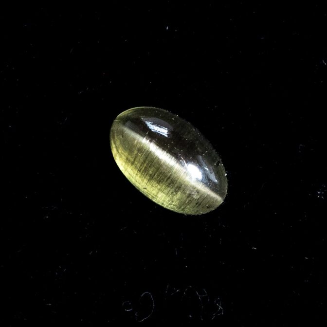 そんな中ツーソンで出会ったのが、アパタイトの中にキャッツアイが見える不思議なルース。透き通ったモスグリーンのアパタイトの真ん中に、ピシリと浮かび上がる光の筋が見事な美しさ。そもそもアパタイトにキャッツアイが入ること自体が珍しいのですが、インクルージョンが集まって作り出される現象なのに、透明度が高いことにもびっくりしてしまいます。今まで色々な石のキャッツアイを見てきましたが、これは綺麗で可愛い。その上、産出が少ないだなんて、コレクション魂に火がついてしまいます。