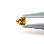 ほとんどオレンジに見えるほどの濃いイエローブラウン。パキッと発色し、濁りやくすみのない鮮烈なカラーは、ひと粒でも圧倒的な存在感があります。ユニークなペアシェイプで色むらがなく、はっきりとした色合いを隅から隅まで楽しめる稀有なルースです。目に見えるインクルージョンがほとんどなく、あくまでも透明な格調高い美しさ。カットされた面の奥の方からチラチラと赤っぽい色のファイアが見え隠れするのにも魅了されます。