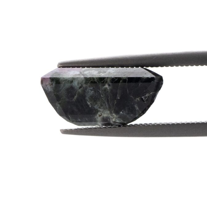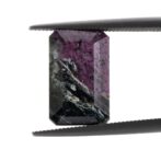 ルビーインゾイサイトにファセットを施すのはさらにさらに至難の技。でも、それをあえてやっている研磨士さんがタイにはいらっしゃるのです。さすが色石の集積地。どちらかというと素朴な可愛らしさを持つ石なのですが、ピシリとシャープなエメラルドカットだと、途端にクールで洗練された雰囲気を身にまとい始めます。こちらのルースは特に、グリーンではなくブラックのゾイサイトとルビーの混ざり具合が最高におしゃれ。白いインクルージョンが清々しいアクセントとなって、美しい調和が保たれています。色合いもバランスも完璧に整っており、磨いた方のセンスが光る一点ものです。