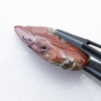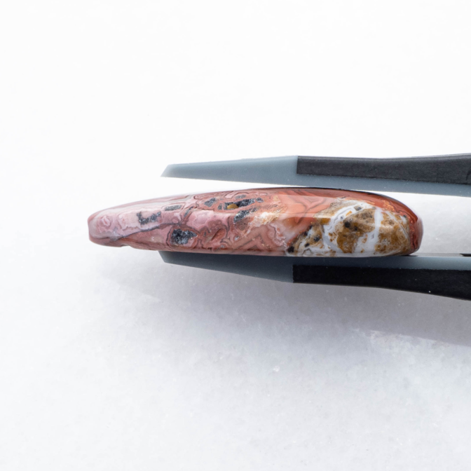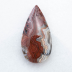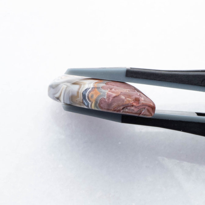 繊細な模様が幾重にもかさなり、レースのような模様を織りなすクレイジーレースアゲート。鮮やかなレッドから柔らかいピンクに変化するグラデーションが美しく、時折顔をのぞかせる無彩色のグレイがクールな表情。ポップに傾きがちなクレイジーレースアゲートですが、渋く落ち着いた色合いの赤色で大人が持つにふさわしい深みがあります。