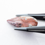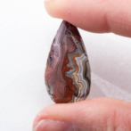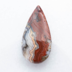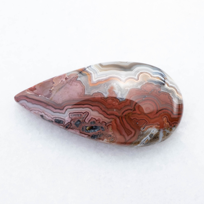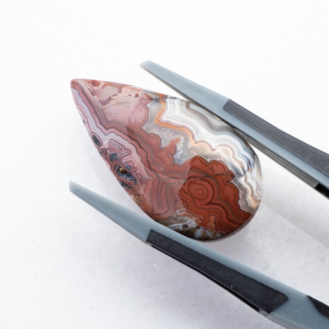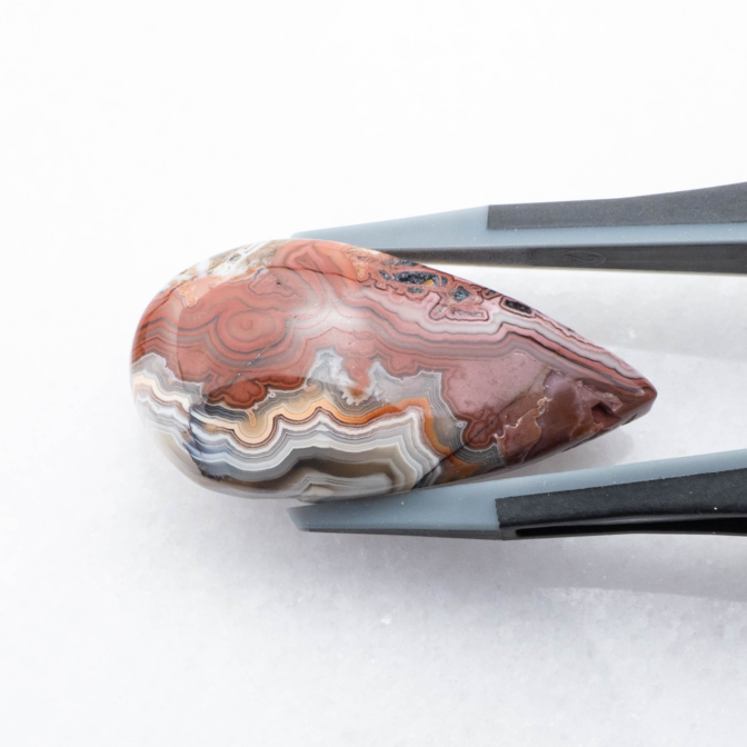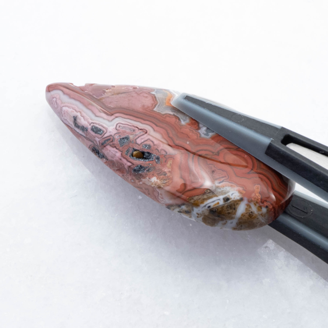 このページでご紹介しているクレイジーレースアゲートは、大粒のドロップシェイプで可愛らしさとワイルドさの両方が魅力。つやりと磨かれていますが、一部に原石由来のへこみがあります。天然ならではの風合いと原石の荒々しさの名残として愛でて頂ければ幸いです。