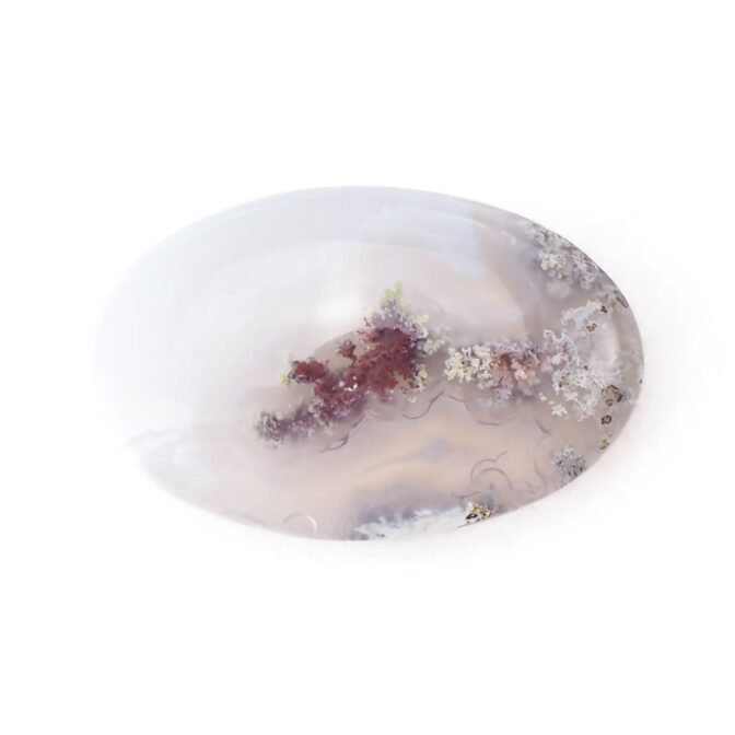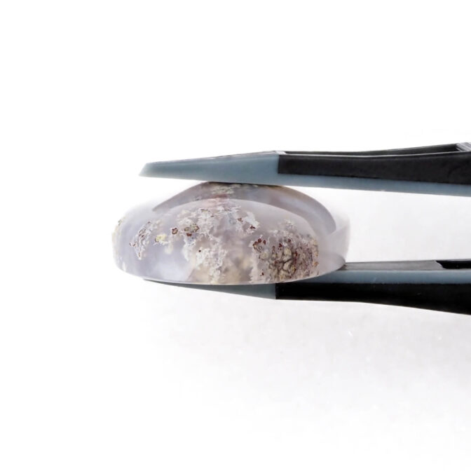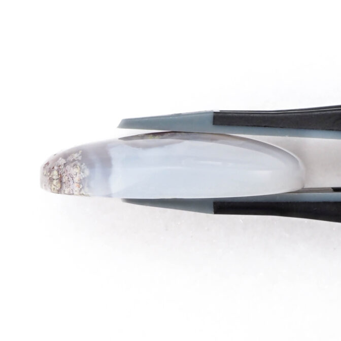 このページでご紹介しているランドスケープアゲートは、滑らかでかつつやつやに磨かれ、乳白から透明〜不透明に変化するグラデーションがより克明に楽しめます。大粒でしっかりしたルースのため、ワイヤーラップやマクラメでアクセサリに仕立てるのがおすすめ。ジュエリーにするならブローチやペンダントが安定します。そのユニークな模様と透け感をどんなワードローブと組み合わせようか考えるのも楽しいですね。