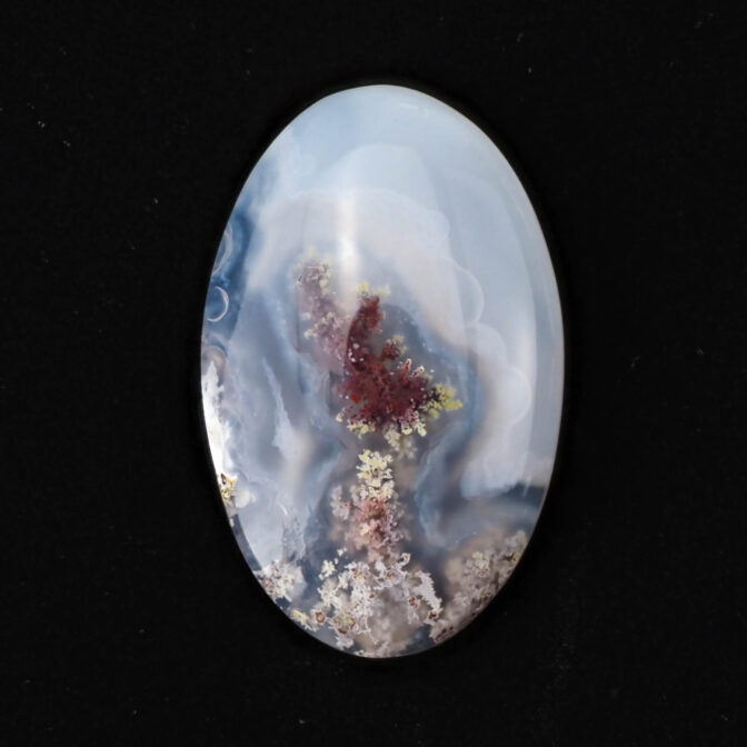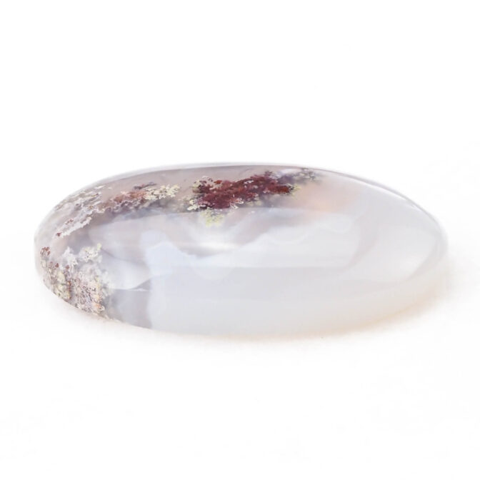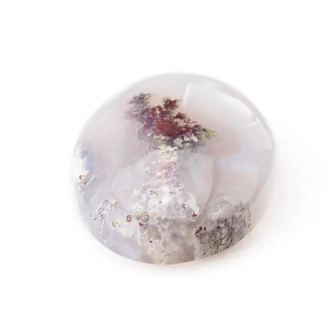 乳白色・半透明・透明・不透明。自然界に存在する透明度のバリエーションを全て集めたようなランドスケープアゲート。それぞれの質感に合わせた透け感が楽しめる上、鮮やかな赤色インクルージョンも可愛らしく、神秘的なルースに仕立てられています。濁りない乳白色の半透明が徐々に透明度を増しながら、インクルージョンを抱き込むように完全な透明になるのがとても魅力的。この、中央にゆらめくように存在する赤と白のインクルージョンは、白い砂を持つ海底に揺蕩う珊瑚礁にも見えます。人によって様々な情景を見ることができるのが、ランドスケープアゲートの魅力です。