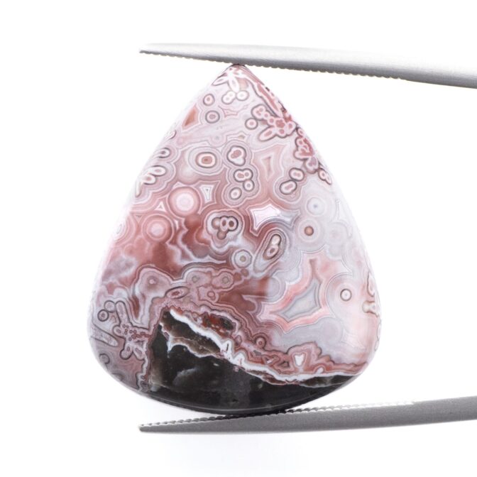 このページでご紹介しているクレイジーレースアゲートは、ふっくらしてころんと丸みがあり、キュートさが目立ちます。彫金でジュエリーにすると大きさが少し気になるかもしれません。マクラメ編みやワイヤーでアクセサリに加工すると気軽に身につけていただけると思います。模様があまりにも美しいので、ルースのまま手元に置いて眺めでも楽しめます。