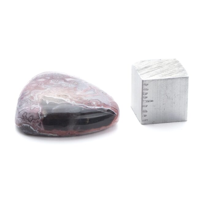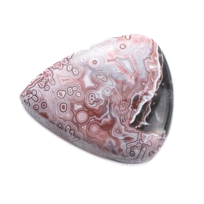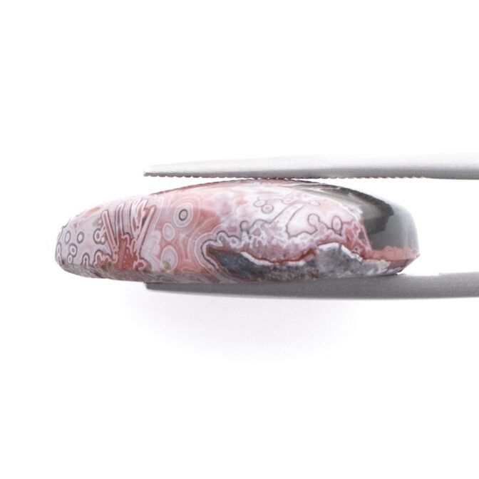 繊細な模様が幾重にも連なり、レースのような柄を織りなすクレイジーレースアゲート。華やかなピンク色は桜のようにほんのりと美しく、情緒があります。それなのに、緻密に折り重なった曲線が描き出す世界観がちょっとカオスなところも見どころです。ポップに傾きがちなクレイジーレースアゲートですが、渋く落ち着いた色合いとランダムな模様には静かな迫力があり、落ち着いた魅力と深みに魅了されてしまいます。