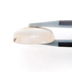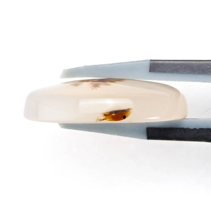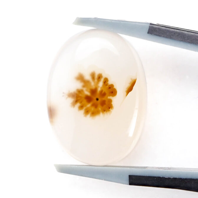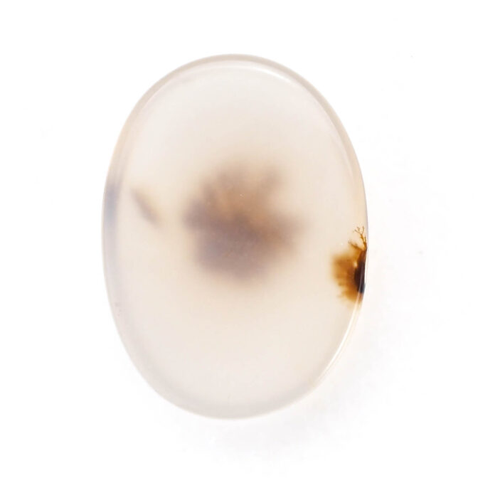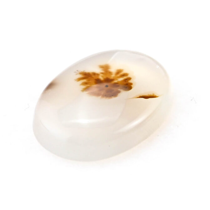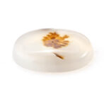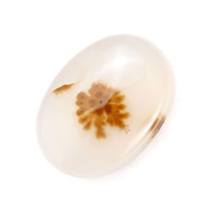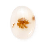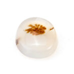 この可愛らしい模様をどのように活かすかが研磨職人の腕の見せ所。丸く滑らかに磨かれたカボションのアゲートにぽつんとセンスよく模様が配置されていて、絶妙なおしゃれさです。ベースとなる半透明でつるんとしたアゲートの美しさもお花模様を引き立てています。