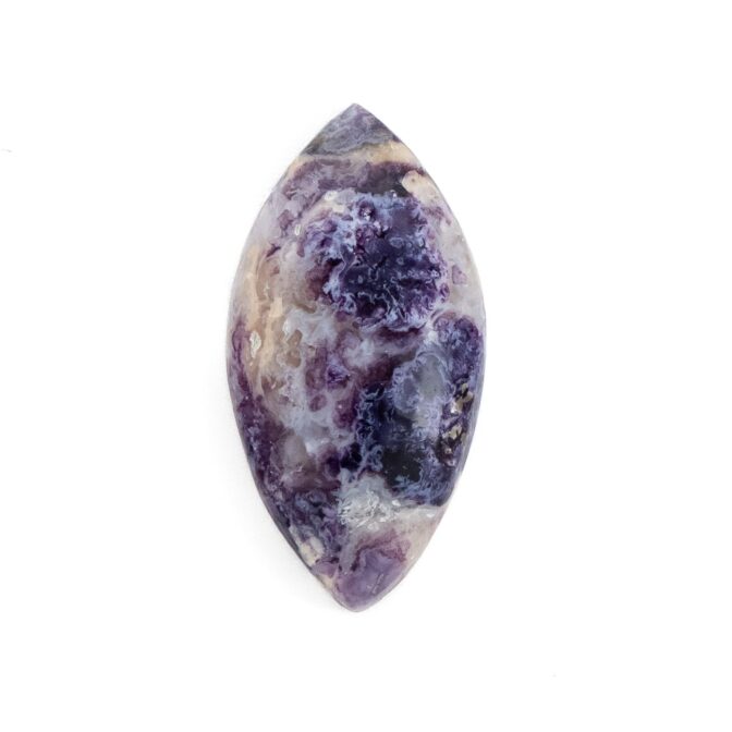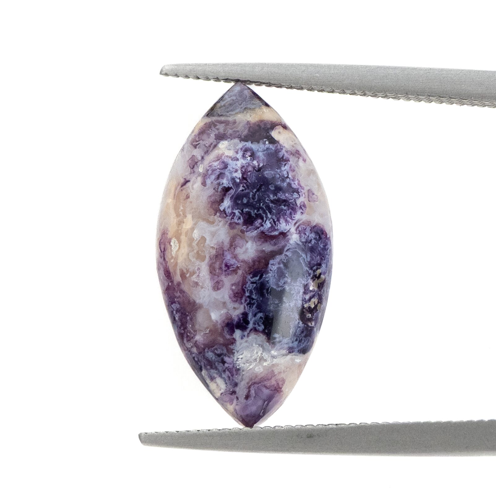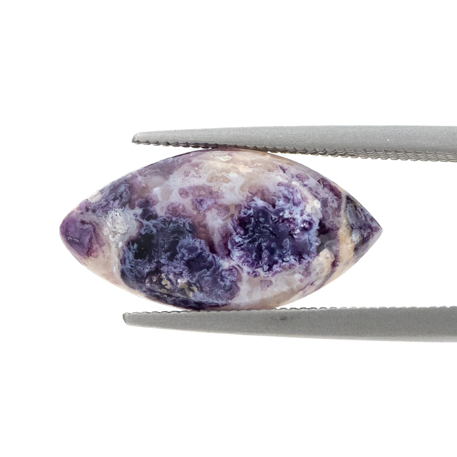 これまで見てきたティファニーストーンは、薄い色合いであることが多く、華やかな印象はありませんでした。今回セレクトしたルースたちは、みな紫の色が濃く、マットなホワイトとのコントラストが見事。2色の対照的な色が織りなす複雑なモザイク模様は、キリッと凛とした美しさで、品よくノーブルな雰囲気です。