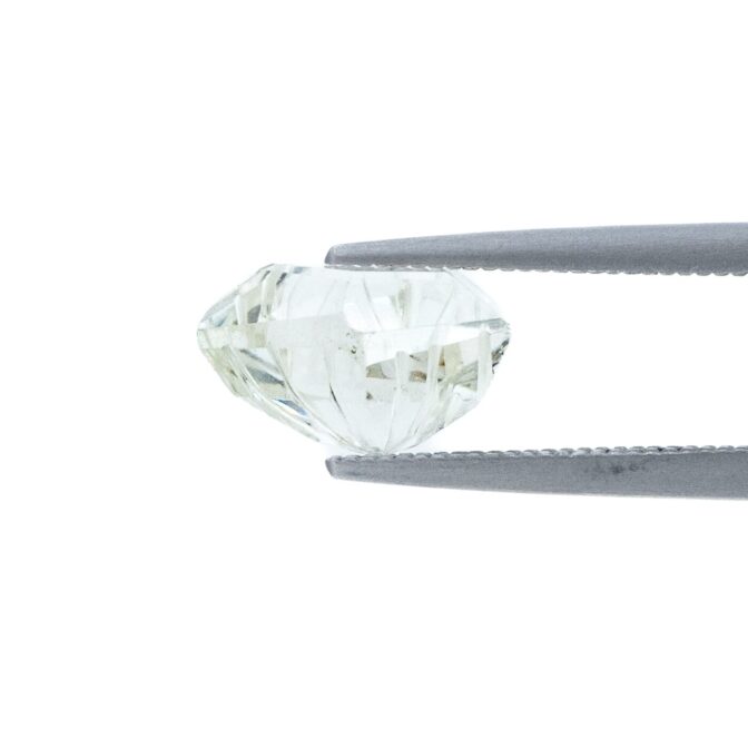 爽やかなミントグリーンの輝きが眩しいグリーンアメジスト。大粒でリッチな質感を持ち、丁寧に施された凝ったカットが映える、非常に美しいルースです。華やかながら透明感あふれる清楚な佇まいで、グリーンアメジストならではの色と輝きの美しさが楽しめます。パビリオン面(裏側)には細く繊細なラインが放射状に切り込まれており、表から見ると、流麗なラインが瞬くようにきらめいて不思議な模様を作り出します。
