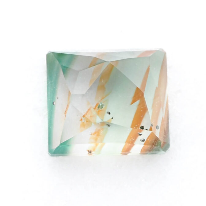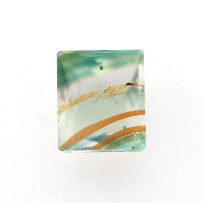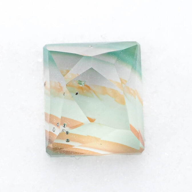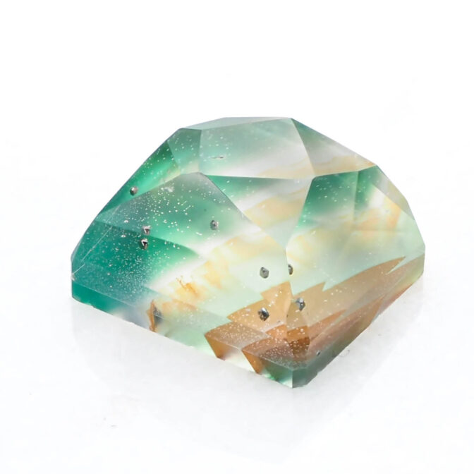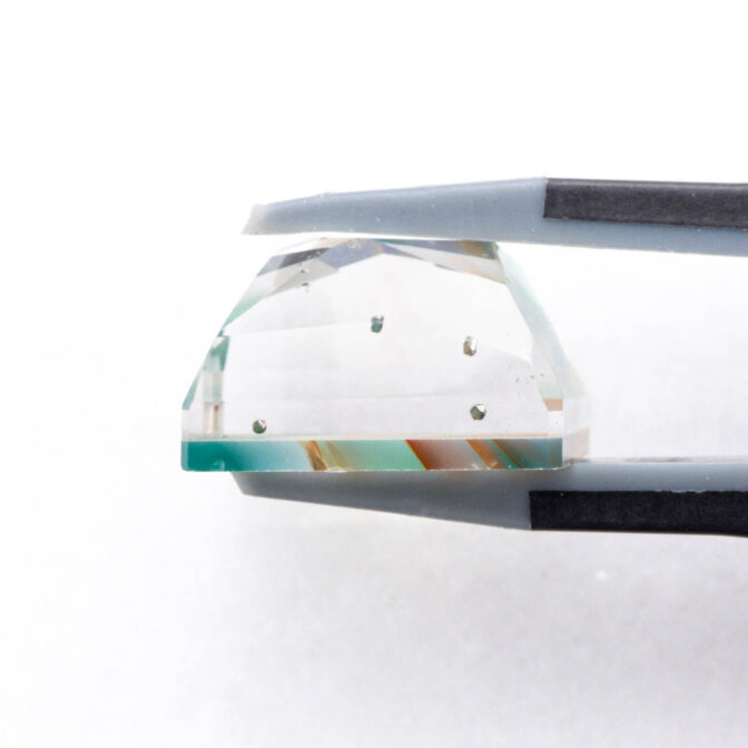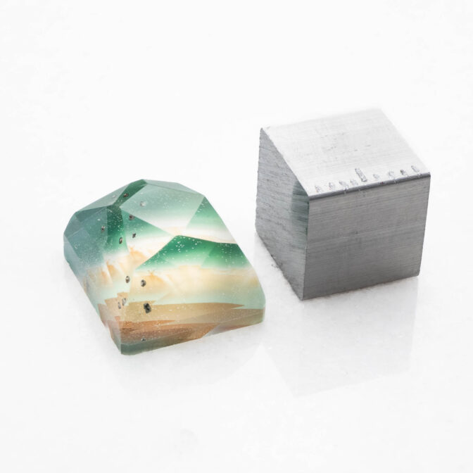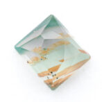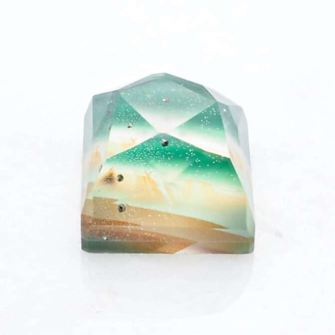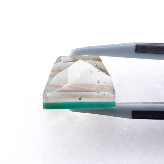 ダブレット制作は絵画や風景、幾何学模様を連想させる石のセレクトから始まります。山ほどある原石からどのように模様を削り出すか。石取りと呼ばれる工程で様々に検討し、ここだ!という部分を薄い板状にカットします。その後、透明度の高いクォーツやルチルクォーツと接着し、カットと磨きを施します。クォーツの磨きが悪いと美しい模様が引き立たないので、磨きはダブレットストーンの完成度を左右する大事な工程と言えます。経験豊かな職人さんの丁寧かつ高いカット技術があるからこそ、クォリティの高いダブレットを生み出すことができるのです。