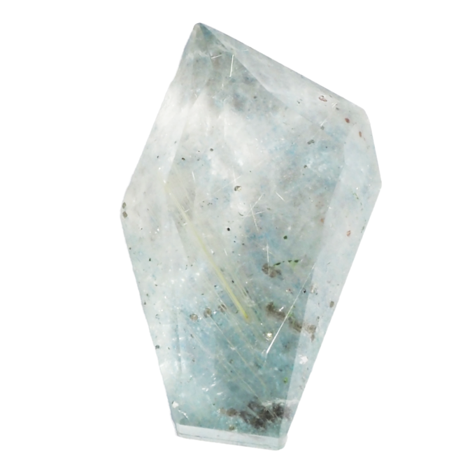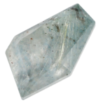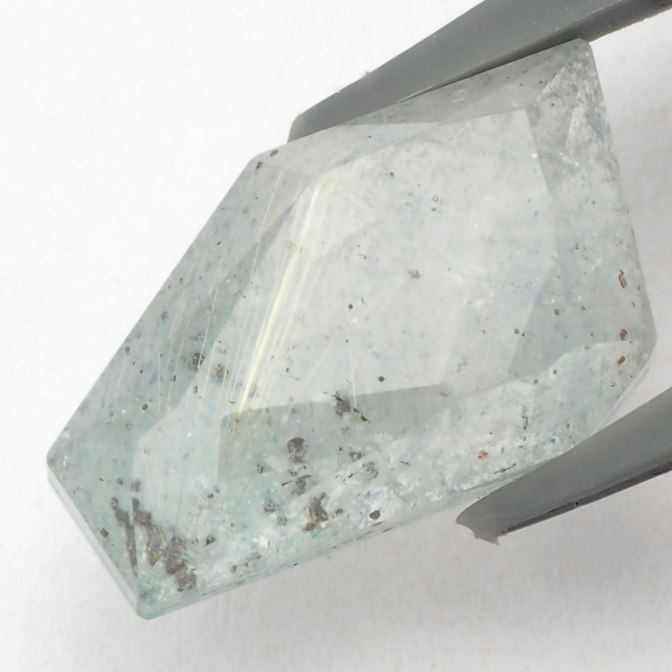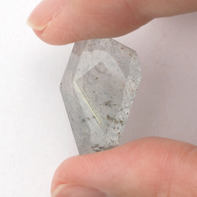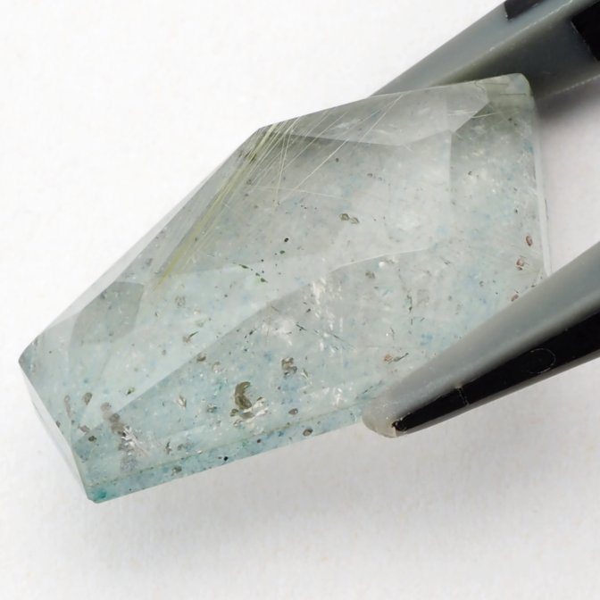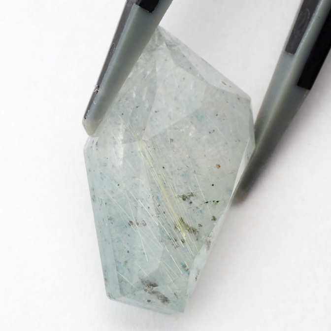 このページでご紹介しているルチルクォーツxブルークォーツのダブレットは原石の形を活かしたユニークな形も魅力的。テーブル面(表側です。)の一辺にサッとひと刷毛金色のラインを引いたようなデザイン性のあるルチルがインパクト大。自由に施されたファセットカットは伸びやかで大胆。こうあるべき、をスッキリと取り払ってくれます。