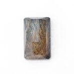 ラブラドライトの中でも漆黒の地色に強く閃くスペクトル色を持ち、「スペクトロライト」と呼ばれる特別な石。フィンランドでしか採掘されない、際立つ美しさを持つスペクトロライトにブロンズ色に鈍く輝くルチルをぎっしり内包したクォーツを組み合わせてタブレットに仕立てました。