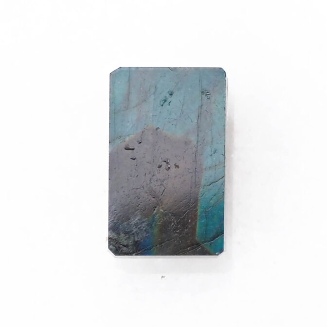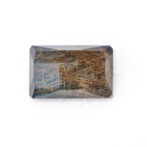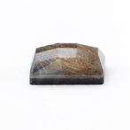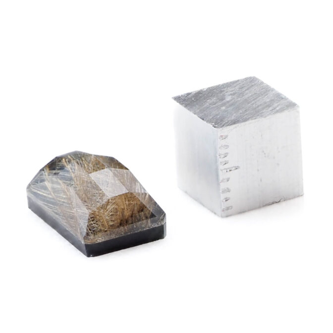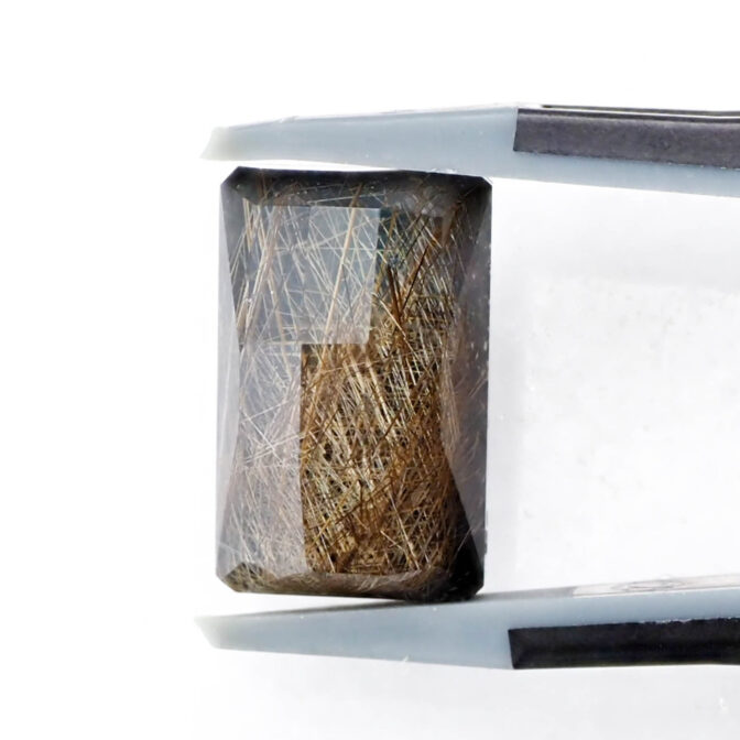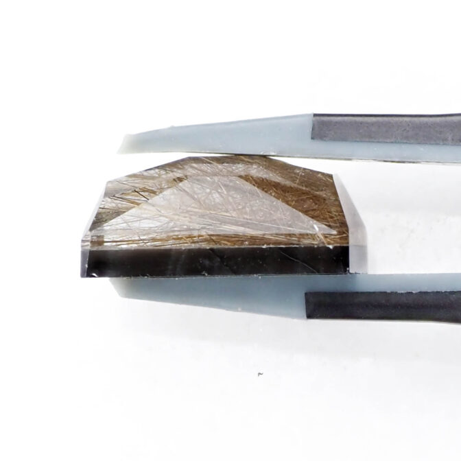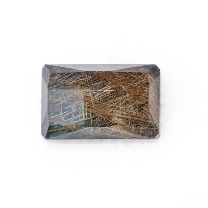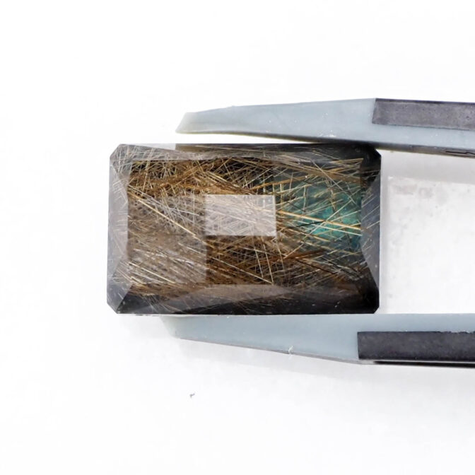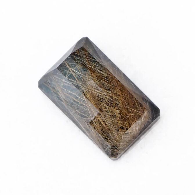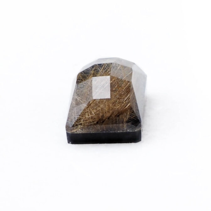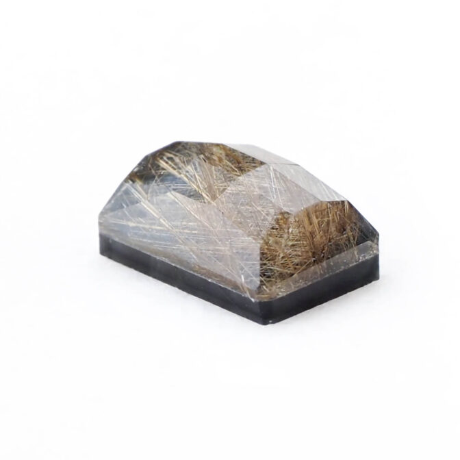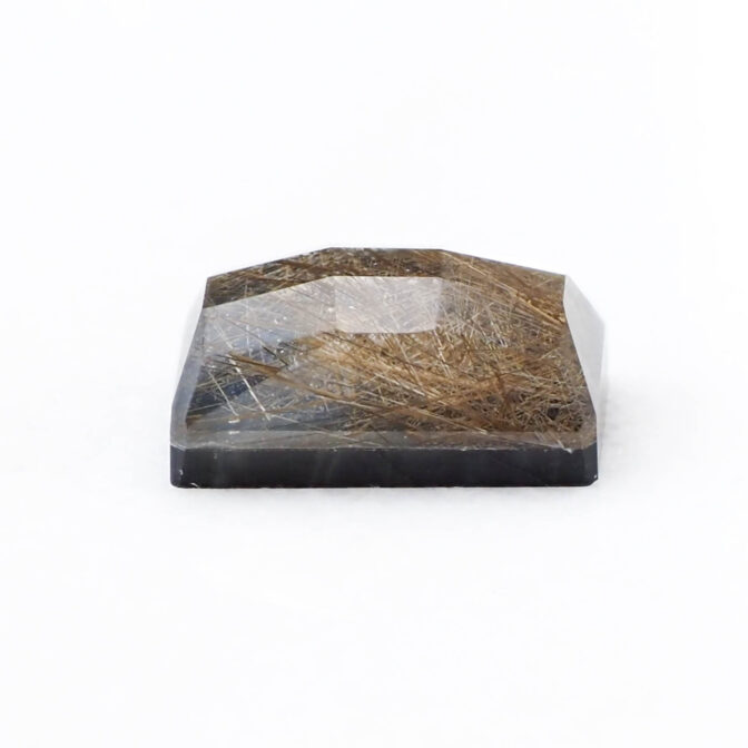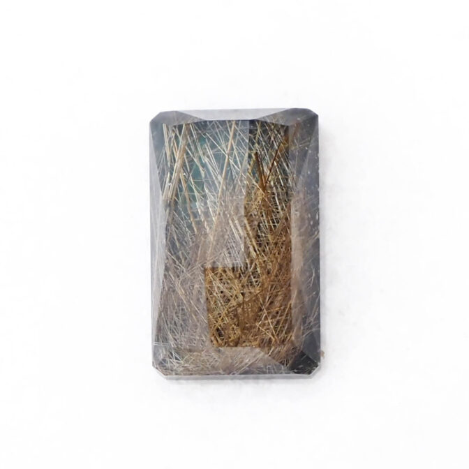 蒼い炎のように輝くスペクトロライトを半ば以上隠すように、細く繊細ながらも情熱的な輝きを持つルチルクォーツがぎっしり。スペクトロライトの持つギラリと強い輝きを、あえてルチルの奥に隠し、抑制された美と絢爛たる風情を一つの石に凝縮した素晴らしい芸術性を感じさせます。テーブル面(表側)は市松模様を連想させる幾何学的なチェスカットで覆われ、ルチルが発する光を引き立たせます。
