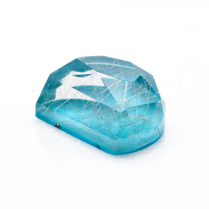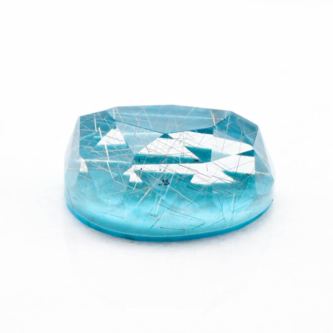 このターコイズブルーを飾る銀色のルチルが印象深く、光を弾いてきらりと瞬く「瞬間の美」から目が離せません。石全体にぱぽつぽつと散りばめられたように見えるルチルだけれど、淡い光の筋がそこかしこでチラチラと瞬き、思うよりもぎっしり入っているところが一筋縄ではいかない魅力です。