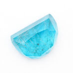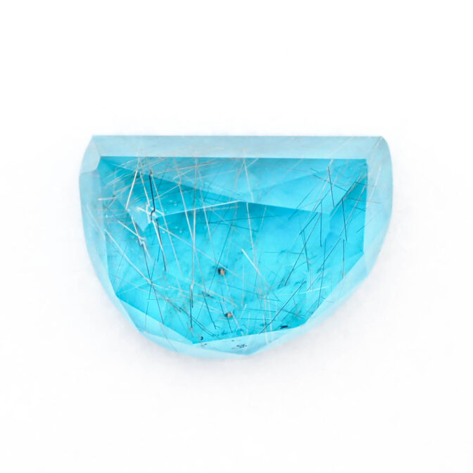このページでご紹介しているルチルクォーツxターコイズのダブレットストーンは、半円形のフリーシェイプに近いカットで、手作業のぬくもりが感じさせる絶妙な抜け感。きっちりしすぎずリラックスしたムードが漂い、夜空に浮かぶ欠けはじめた月のようで神秘的。透明感の高い良質なルチルクォーツを贅沢に使い、豊かなきらめきを生み出します。