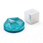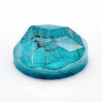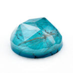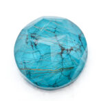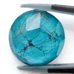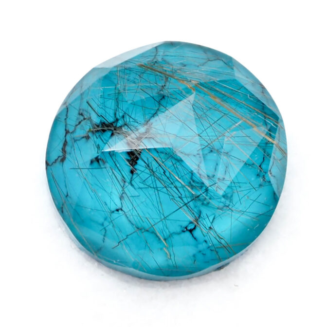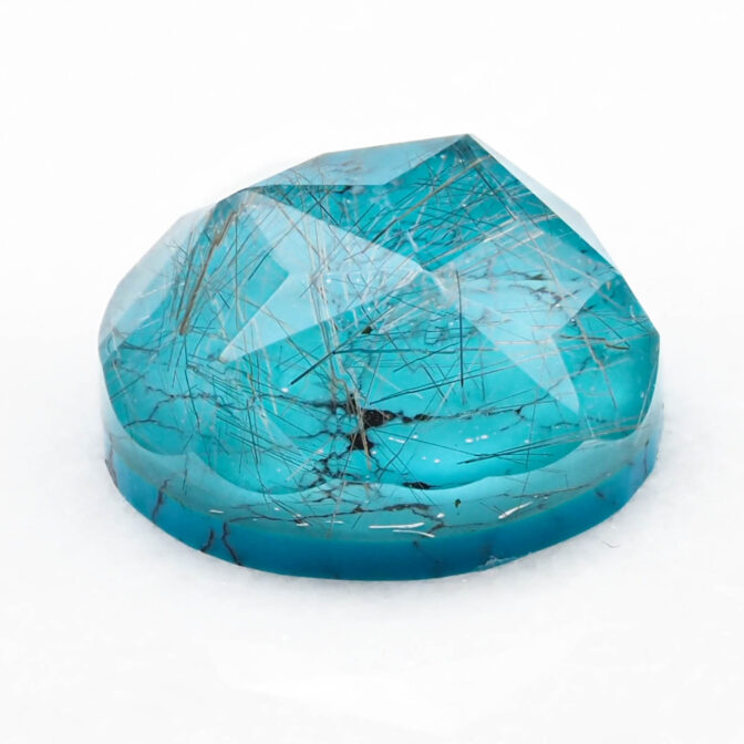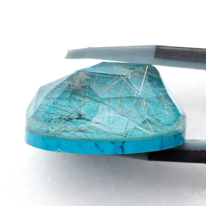 このページでご紹介しているルチルクォーツxターコイズのダブレットはラウンドにカットされ、惜しむことなく使われたルチルクォーツが豊かなきらめきを生み出します。全体にバランス良く散りばめられたルチルのシャープな金属光沢が、不透明でマットな質感のターコイズを飾っています。ランダムにカットされたクォーツが光を捉え、ターコイズに波紋を映し出し南国の遠浅の海のような情景を生み出します。不規則に光を反射し、目を射るような輝きに不意に胸を掴まれてしまう魅力あふれるルースです。