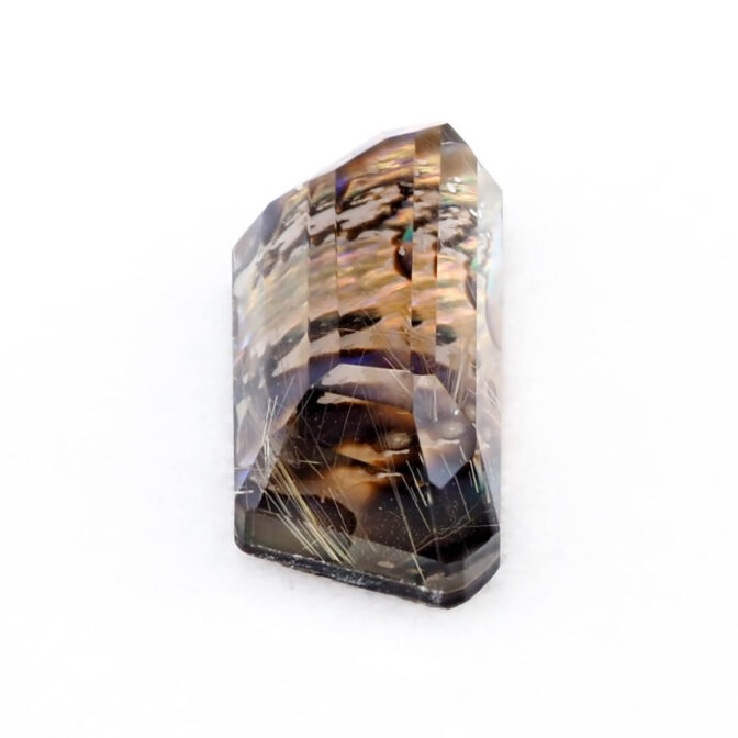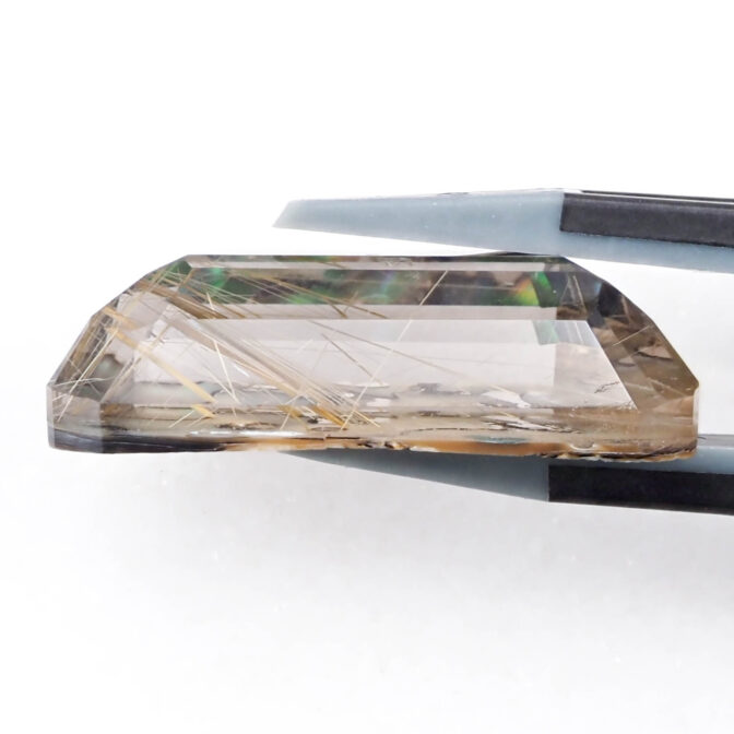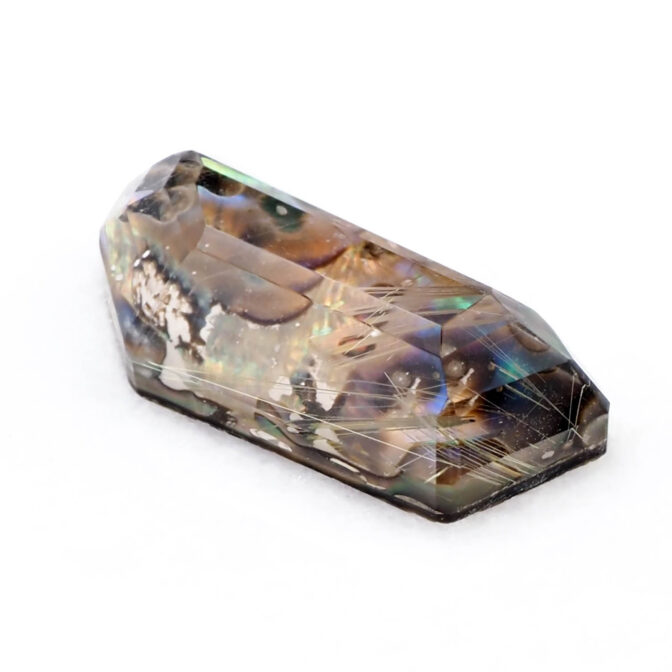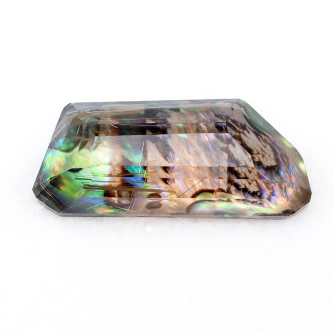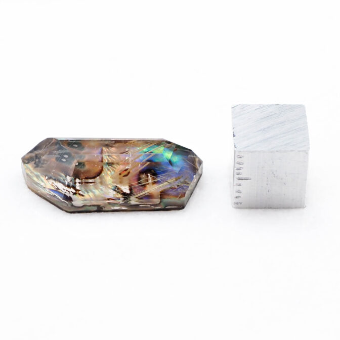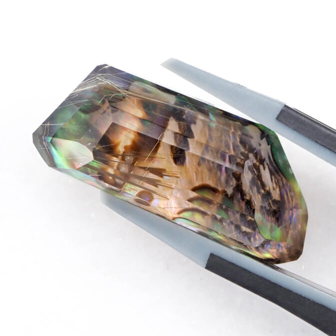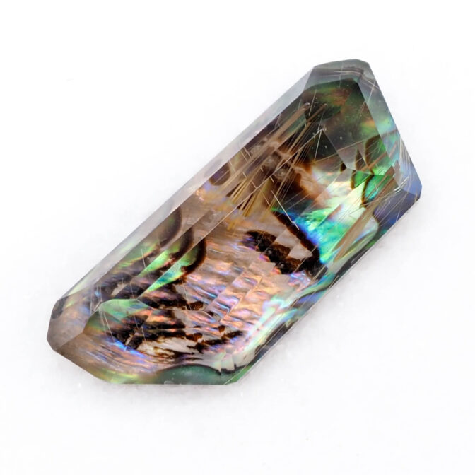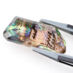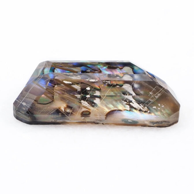 インクルージョンがほとんどない驚異的な透明度を誇るルチルクォーツに、七色の光を放つパウアシェルを重ねて作り出されたダブレットストーン。ルチルクォーツから差し込む光が、パウアをまばゆく照らし出し、みずみずしい生命力あふれるルースに仕上げられています。