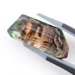 ダブレット制作は絵画や風景、幾何学模様を連想させる石のセレクトから始まります。山ほどある原石からどのように模様を削り出すか。石取りと呼ばれる工程で様々に検討し、ここだ!という部分を薄い板状にカットします。その後、透明度の高いクォーツやルチルクォーツと接着し、カットと磨きを施します。クォーツの磨きが悪いと美しい模様が引き立たないので、磨きはダブレットストーンの完成度を左右する大事な工程と言えます。経験豊かな職人さんの丁寧かつ高いカット技術があるからこそ、クォリティの高いダブレットを生み出すことができるのです。