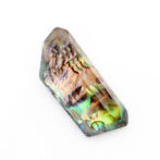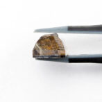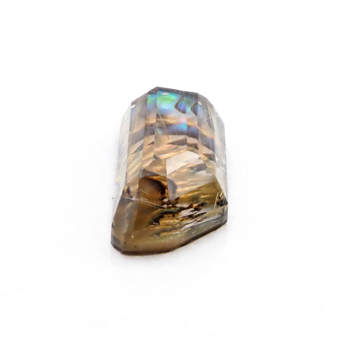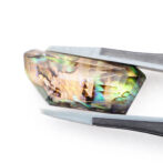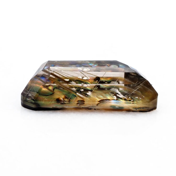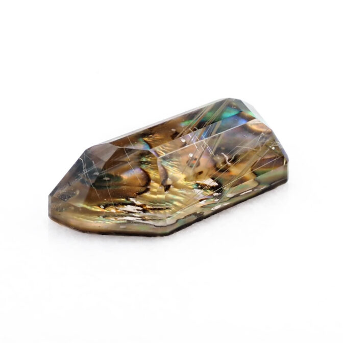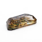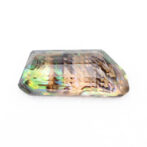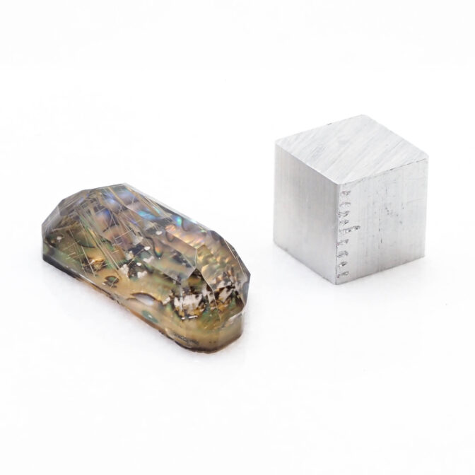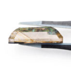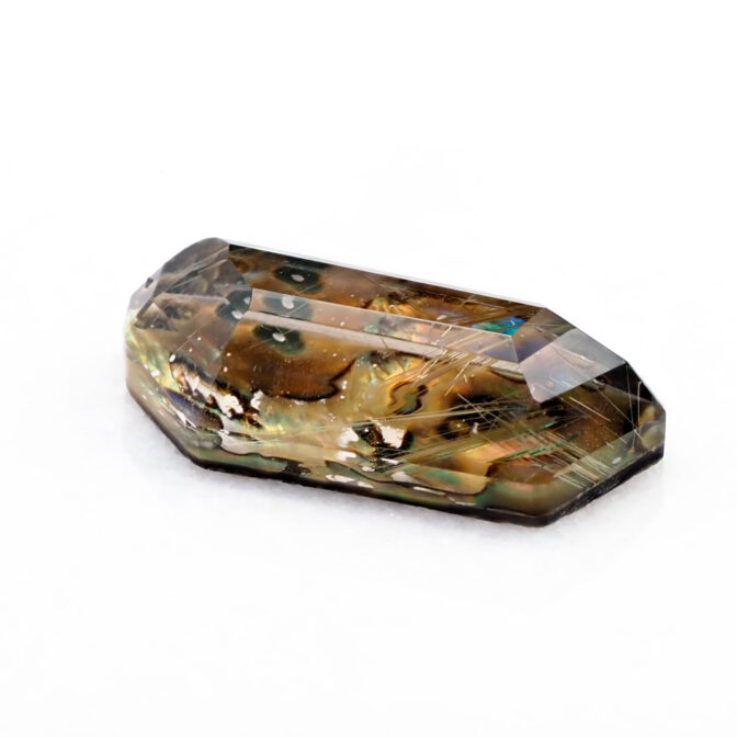 このページでご紹介しているルチルクォーツxパウアシェルは、シャープさを感じさせるフリーシェイプにカットされ、まばゆい美しさを放ちます。パウア自体に黄金色の輝きがあるので、ルチルは控えめに見えます。角度を変えるとまっすぐに差し込む光の束のようなルチルが、しっかりと姿を表します。程よく厚みがあり、大粒で存在感と個性あふれるルース。ジュエリーにするのも素敵ですし、コレクションピースとして眺めるのも素晴らしい楽しみ方です。細長い形なので、個人的にはペンダントへのお仕立てをお勧めしますが、大粒リングラバーさんにはもちろん、リングへのお仕立てをお勧めしますよ。