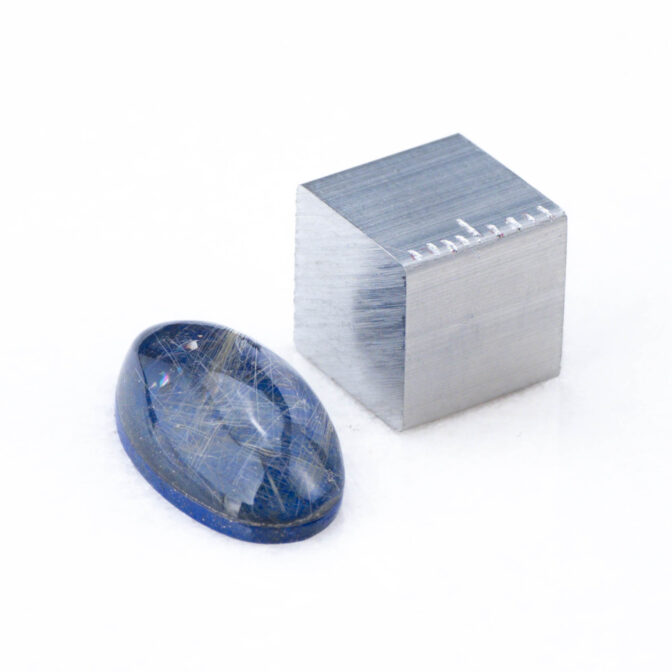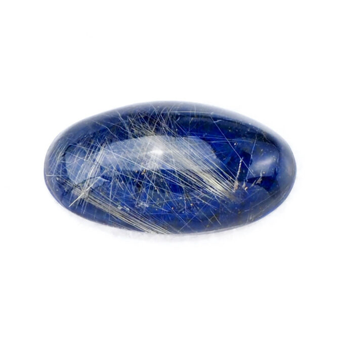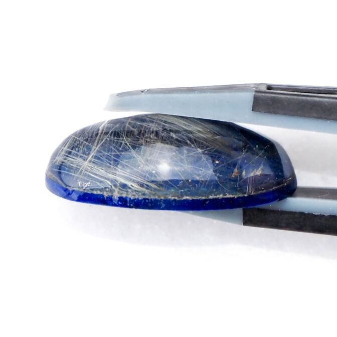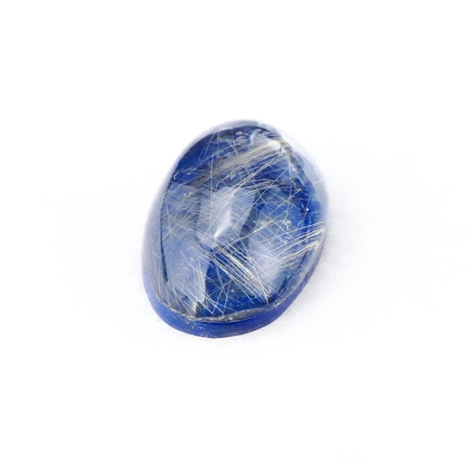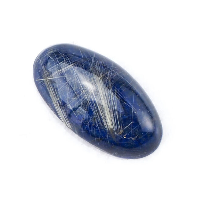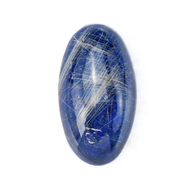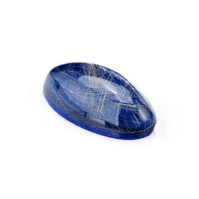 このページでご紹介しているルチルクォーツxラピスラズリは、細身のマーキスカボションに磨かれ、優美な曲線がセンシュアルな雰囲気。澄んだ輝きを放つ極細の針が角度を変えるたびに、光を受けてきらりと光芒を放ちます。厚みがなく、ダブレットストーンの中では小ぶりのサイズ感。縦使いでリングにすると指がスラリと長く細く見えるのもポイントです。もちろん、しっかりとした大きさがあるため、ペンダントトップにもおすすめですよ。