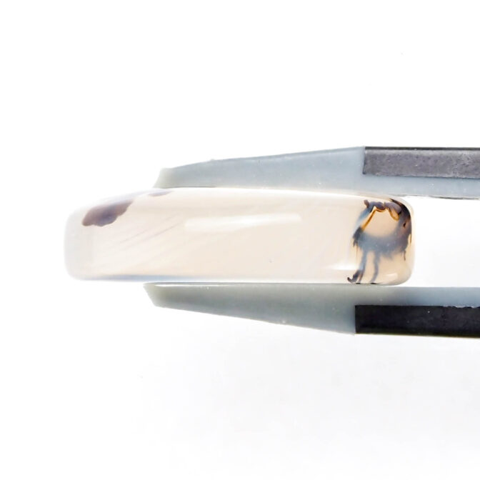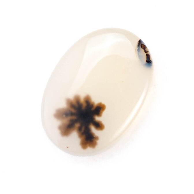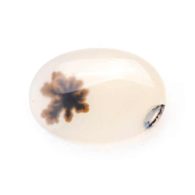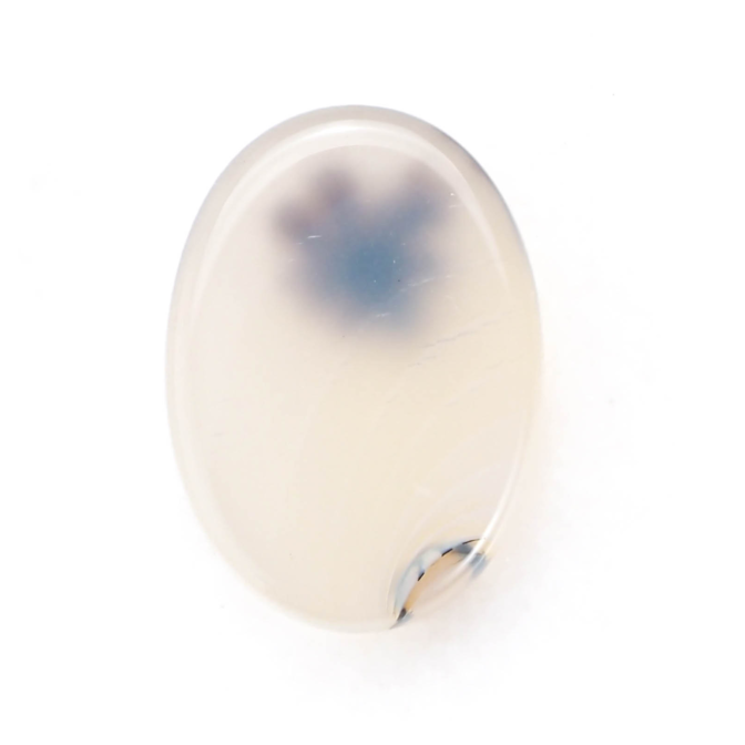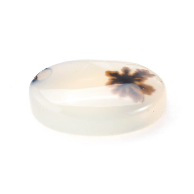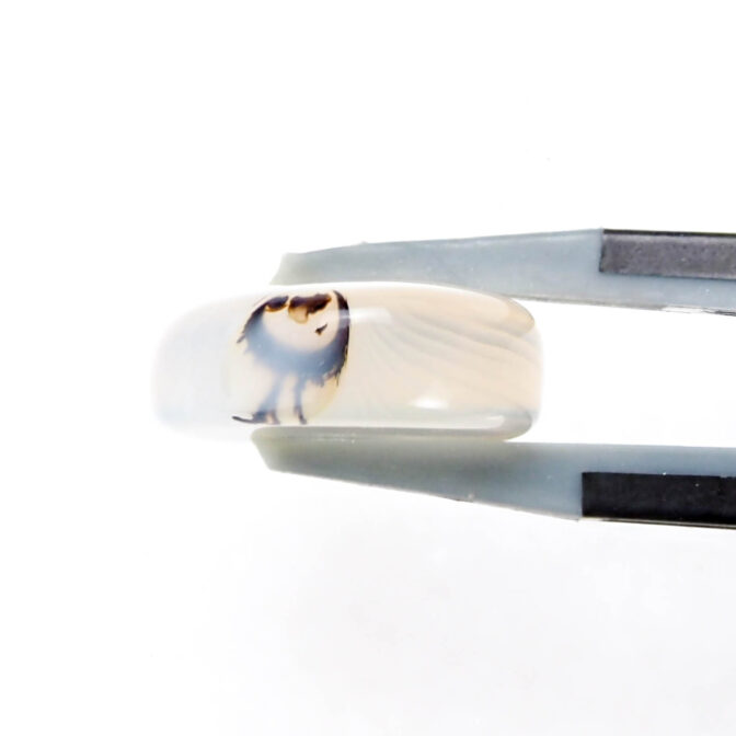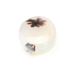 この可愛らしい模様をどのように活かすかが研磨職人の腕の見せ所。丸く滑らかに磨かれたカボションのアゲートにぽつんとセンスよく模様が配置されていて、絶妙なおしゃれさです。ベースとなるアゲートの質がとても高く、半透明でぷるぷるなのも魅力的。光を柔らかく透かして輝く半透明の質感が、インクルージョンのかわいらしさを引き立てています。