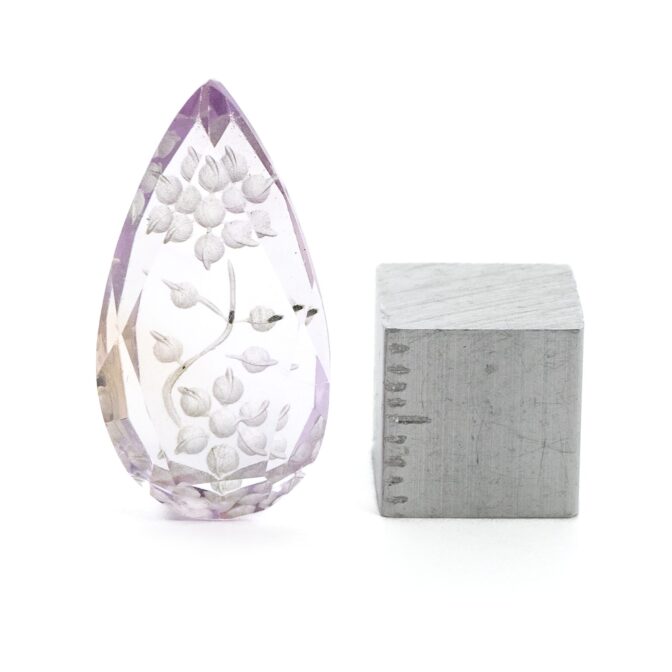 そんな希少な技術で彫り込まれたのは、ため息が出るほど繊細な「花」。 本来は硬く無機質な鉱物であるはずのアメトリンに、まるで生命が宿ったかのような、柔らかな花びらが咲き誇っています。