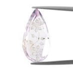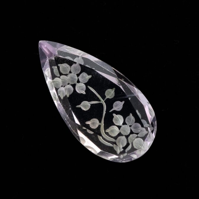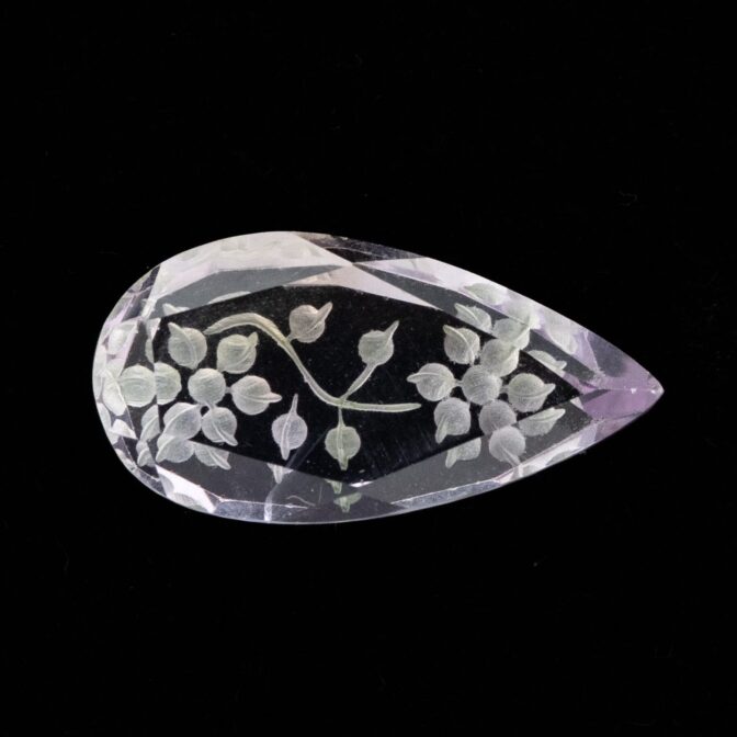 今回セレクトしたのは、この精緻な彫りを一切邪魔しない、極めてクリアな原石から研磨されたルースのみ。 フリーカットの直線的なシェイプが、花の柔らかさをより一層引き立てる力強いコントラストを生んでいます。