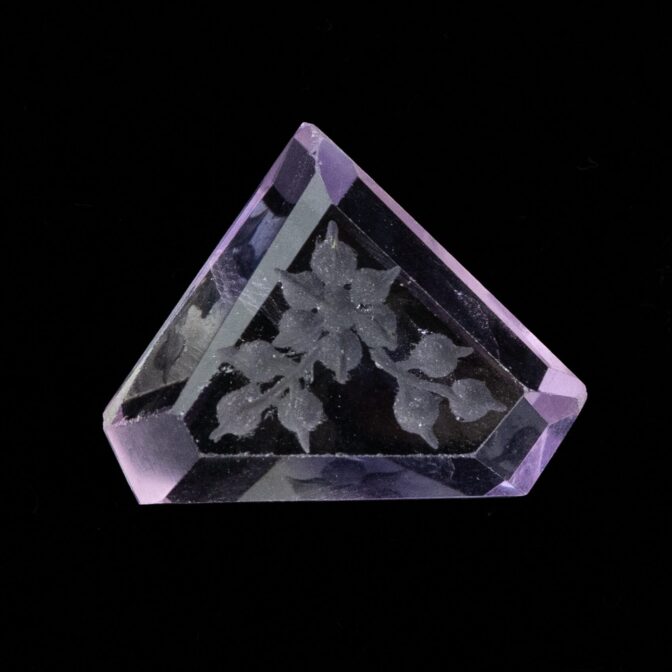 今回セレクトしたのは、この精緻な彫りを一切邪魔しない、極めてクリアな原石から研磨されたルースのみ。 フリーカットの直線的なシェイプが、花の柔らかさをより一層引き立てる力強いコントラストを生んでいます。
