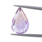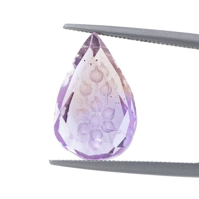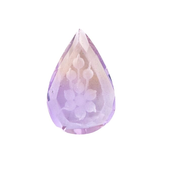 とてもユニークで人気があるアメトリンにさらにひと工夫。裏から模様を彫り込む「インタリオ」の技法で、美しく咲き誇る花を表現しています。このインタリオという技法は、表から見せる模様を裏から彫るため、とても手間がかかります。少し彫り進めては裏返し、見え方を確認しつつ調整を加えるという工程を繰り返すので、通常の浮き彫りよりも手間と時間がかかるのです。