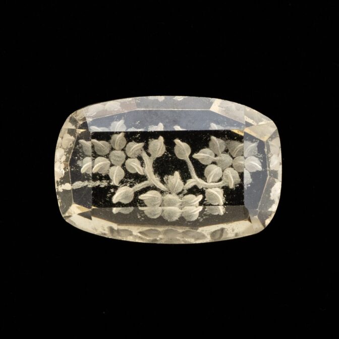 そんな普遍性のある美しさのレモンクォーツに一ひと工夫。裏から模様を彫り込む「インタリオ」という技法で、美しく咲き誇る花を表現しています。この技法は、表から見える模様を裏から彫るため、とても手間がかかります。少し彫り進めては裏返し、見え方を確認しつつ調整を加えるという工程を繰り返すので、通常の浮き彫りよりもさらに時間がかかるのです。