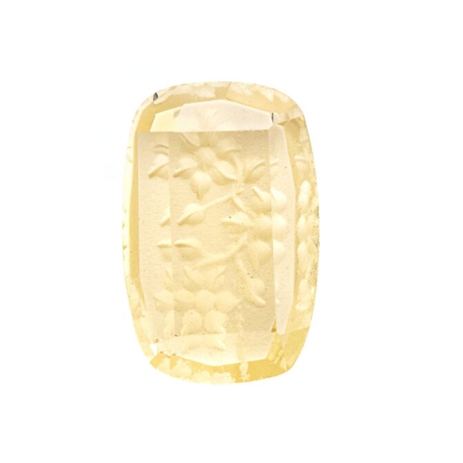 このページでご紹介しているレモンクォーツのインタリオは、本来無機物である鉱物に、まるで生命を持つかのような大輪の花が、柔らかく咲き誇るように彫り込まれています。花びらの一枚一枚が、ため息が出るほど美しい繊細さ。レモンクォーツという素晴らしいカンバスに、のびのびと描かれた植物が、光に当たるたびにキラキラとした輝きと彩りに包まれ、華やかに咲き誇ります。
