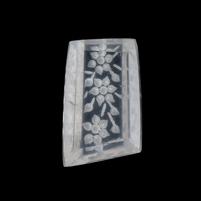 クォーツ系の石の中では最も細かい細工に向かない石に、よくぞここまで美しく彫りを入れたものだ、と感心してしまいます。小さければ小さいほどインタリオは難しくなりますので、今までのインタリオの中ではやや大ぶり。小粒インタリオでは満足できない方にもおすすめです。ルースのまま眺めても良いですし、大ぶりのペンダントに仕立ててもモダンな仕上がりになると思いますよ。
