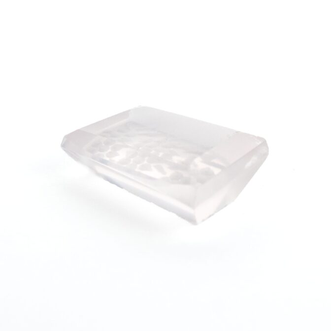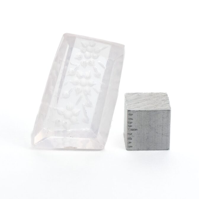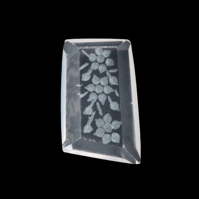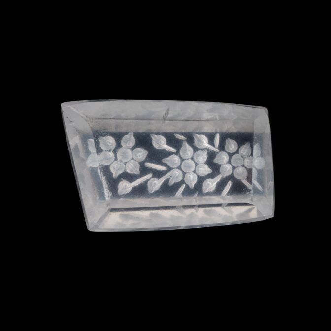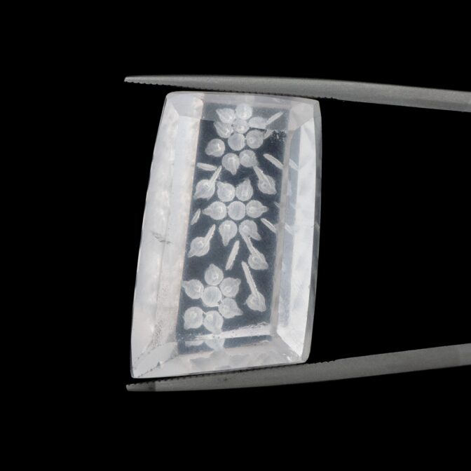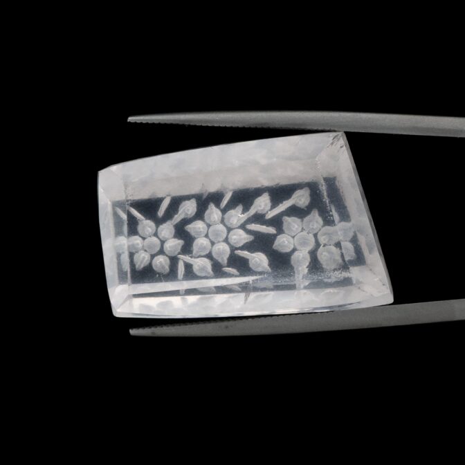 そんな普遍性のある美しさのローズクォーツに一ひと工夫。裏から模様を彫り込む「インタリオ」という技法で、美しく咲き誇る花を表現しています。この技法は、表から見える模様を裏から彫るため、とても手間がかかります。少し彫り進めては裏返し、見え方を確認しつつ調整を加えるという工程を繰り返すので、通常の浮き彫りよりもさらに時間がかかるのです。