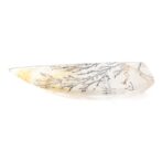 全体的に優しい雰囲気なのに、カットはとても個性。細長い形ので、ペンダントに加工するのが普通だと思いますが、リングにしたら可愛いだろうな、などと妄想してしまいます。鉱物であるのが信じられない柔らかそうなインクルージョンと、瞬くように輝くクォーツの美しさは、手元でめでたくなるのが人情ってもんです。