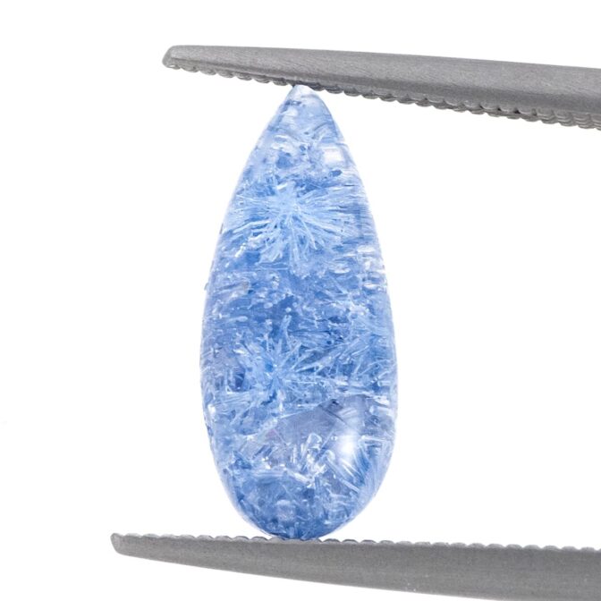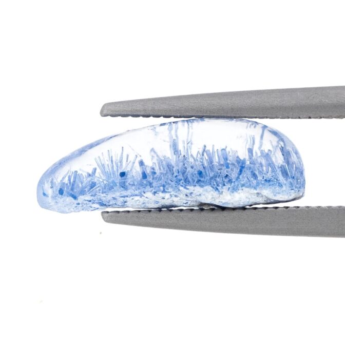 澄み切ったクォーツの中に、青紫色のキラキラ輝く結晶がぎっしり。デュモルチェライトインクォーツの魅力、そのど真ん中を撃ち抜くような正統派のルースです。クォーツの中で、結晶の花が咲き誇っているようにも見えます。そんな、言葉では言い表せぬほど華やかにきらめく美しい結晶を持つ石達には、本当に久しぶりに出会いました。