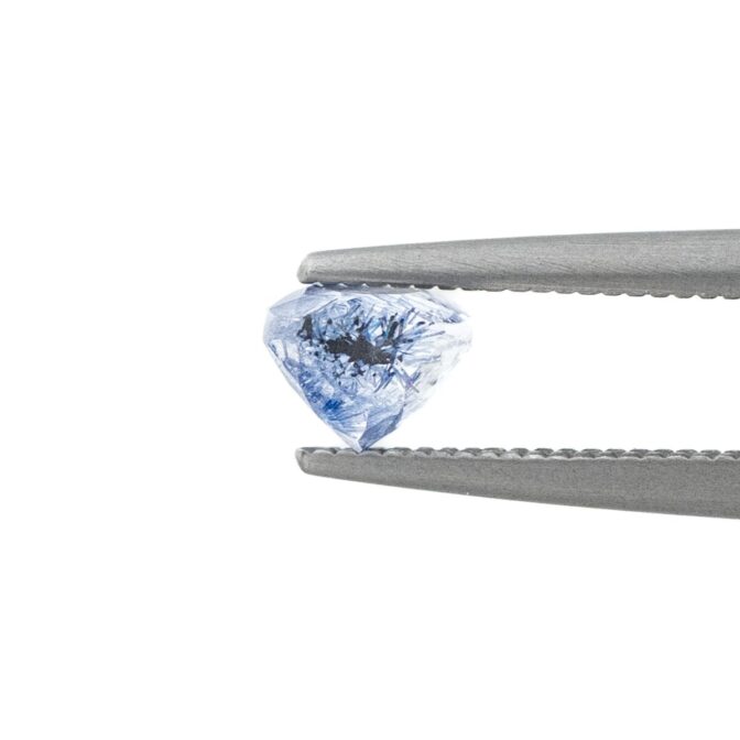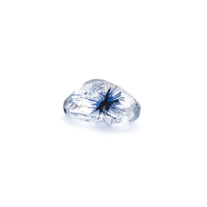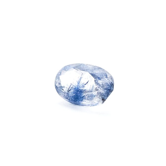 澄み切ったクォーツの中に、青紫色のキラキラ輝く結晶が神秘的。クォーツの中で、結晶の花が咲き誇っているようにも見えます。そんな、言葉では言い表せぬほど華やかにきらめく美しい結晶を持つ石達には、本当に久しぶりに出会いました。特にファセットにするには、水晶の結晶の真ん中にデュモルチェライトが入っている必要があり、研磨の難しさがカボションカットの比ではありません。クォーツのきらめきの中で静かに花開くデュモルチェライトの結晶の、蠱惑的とも言える麗しさは、カボションとはまた違った魅力にあふれています。