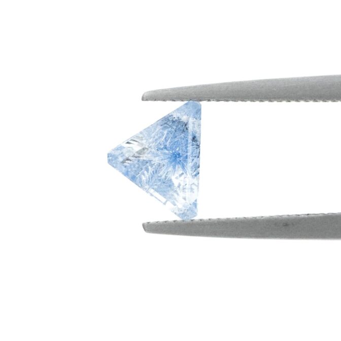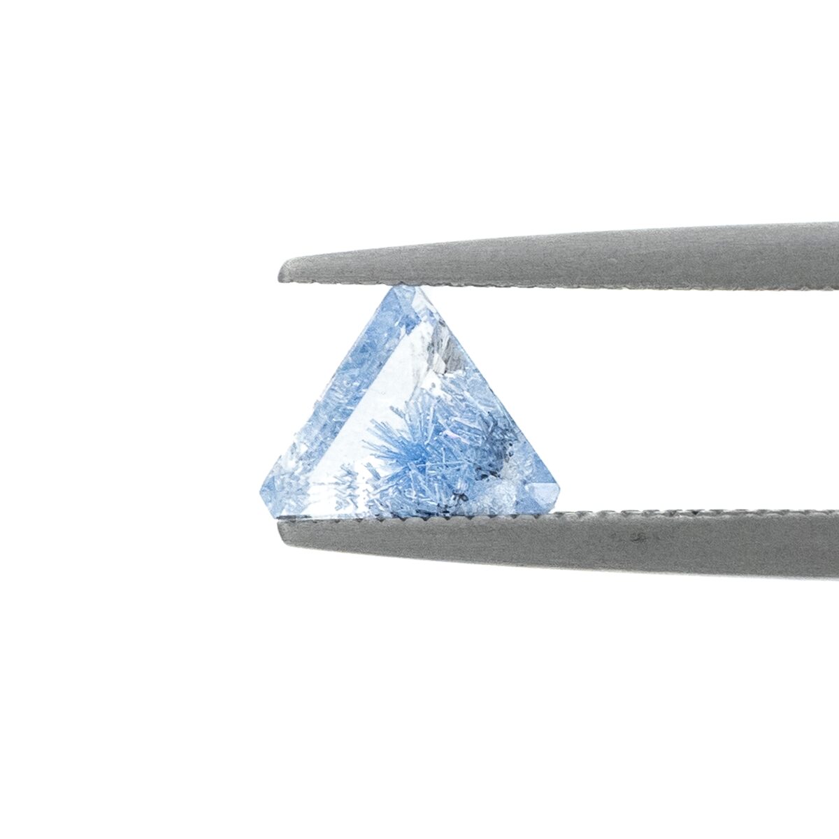 一般的にカボションにされることが多いこの石を、あえて多面体にカットする贅沢。 クォーツの真ん中に完璧な状態で結晶が位置していなければならず、その研磨の難しさはカボションの比ではありません。澄み切ったクォーツのきらめきの中で、静かに、そして華やかに花開く青紫の結晶。光が差し込んだ瞬間、忘れな草のような濃厚かつ優しいブルーがキラキラと表情を変える様は、言葉を失うほどの麗しさです。